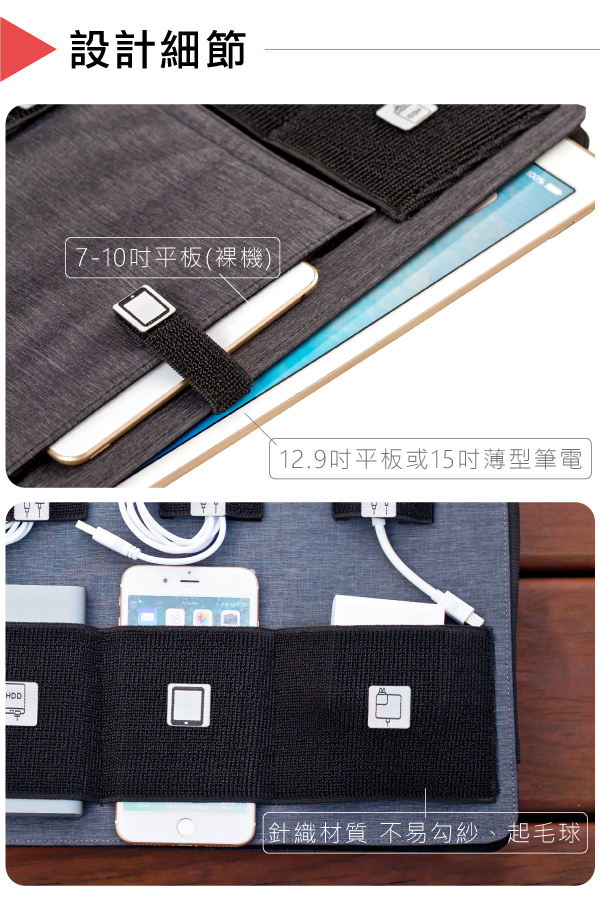 ◆ 配件一對一收納 聰明備忘魔術貼 ◆ 豐富雙面收納空間 便攜包中包概念 ◆ 可收納7-12.9"平板、15"薄型筆電 ◆ 電子產品平面收納 機場安檢一秒通關