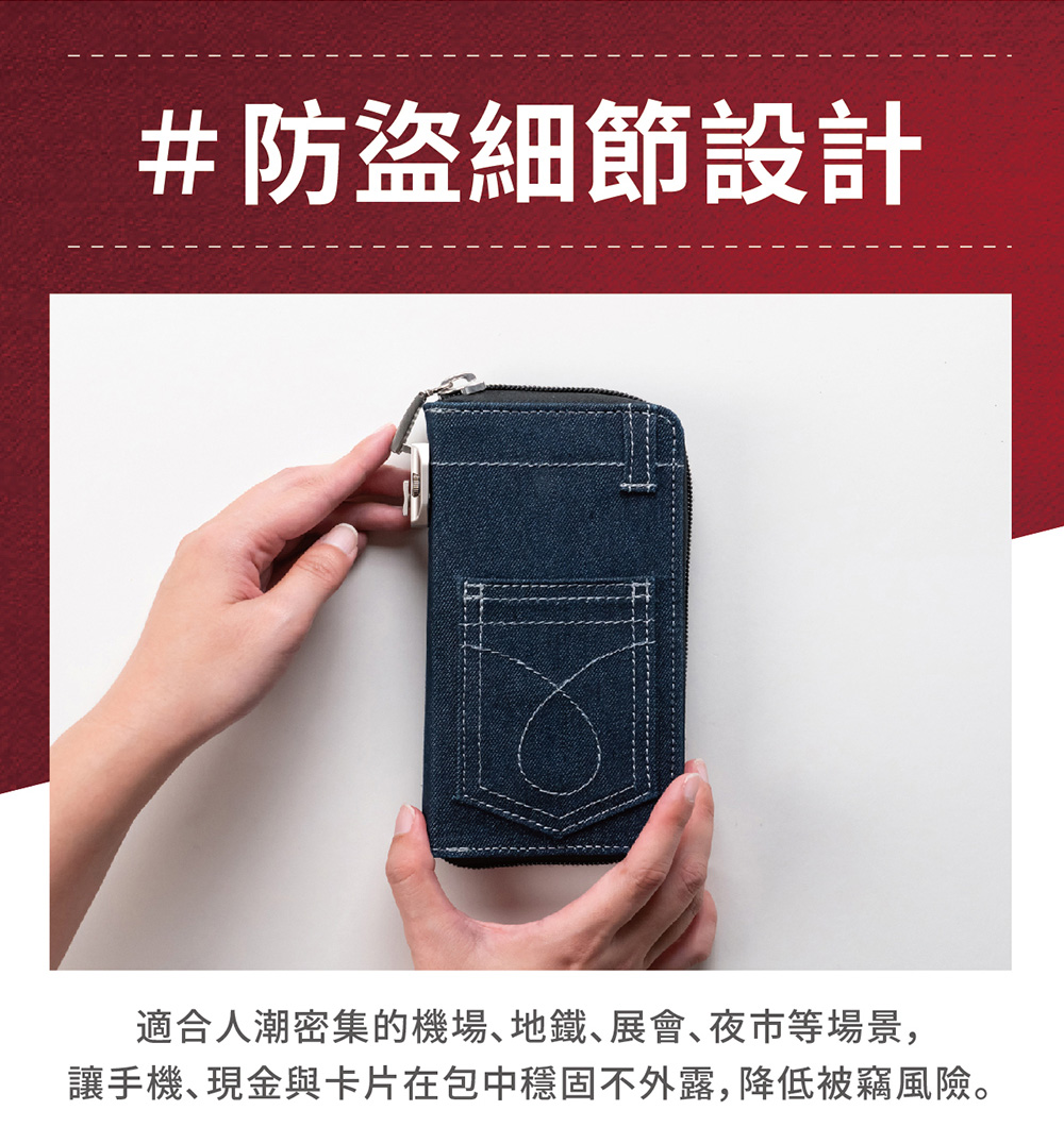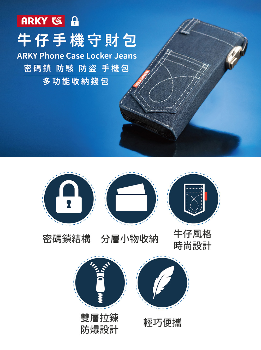 包裝內容物:ARKY 防盜密碼鎖牛仔手機包 多功能收納錢包 x 1