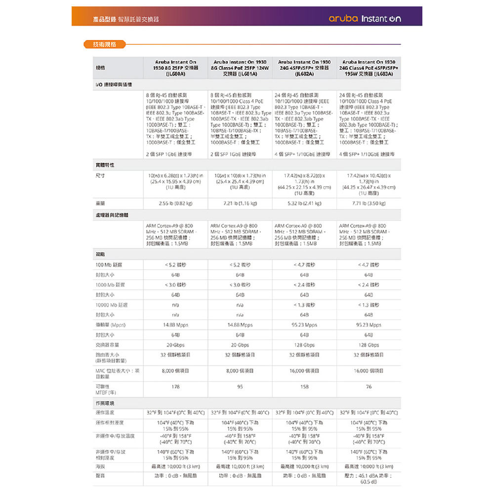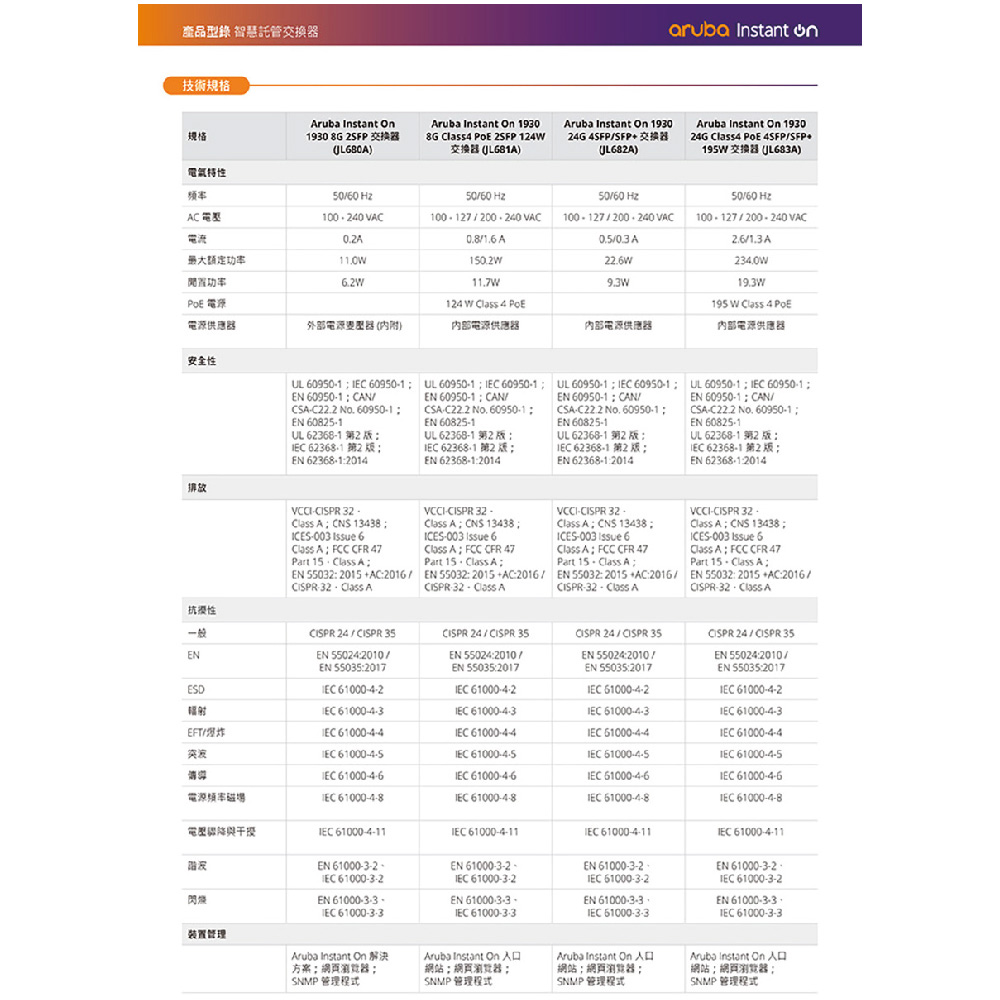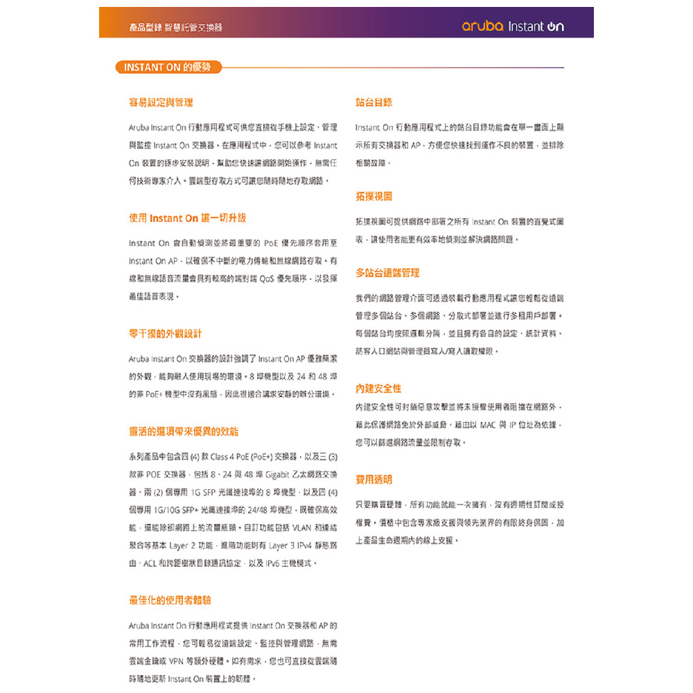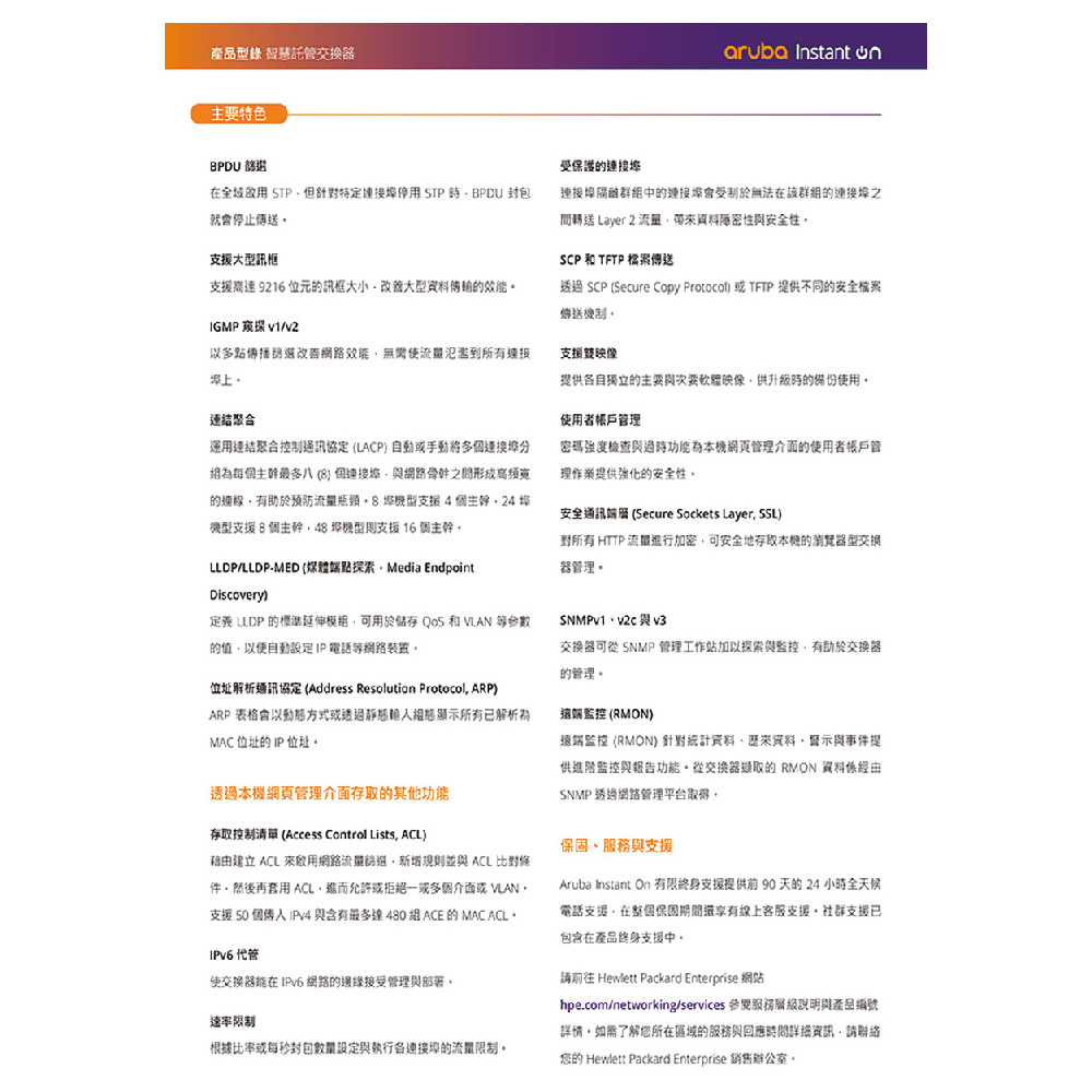 管理功能: Aruba Instant On 入口網站、網頁瀏覽器、SNMP 管理程式