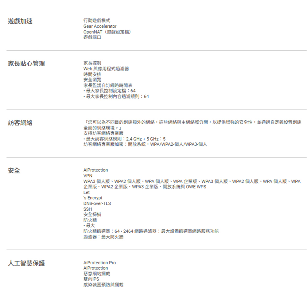 - 4K-QAM、MLO、雙10G連接埠、SFP+、四組2.5G連接埠、四組1G連接埠、34G WAN/LAN容量、完全免費的高度網路安全防護、VPN。