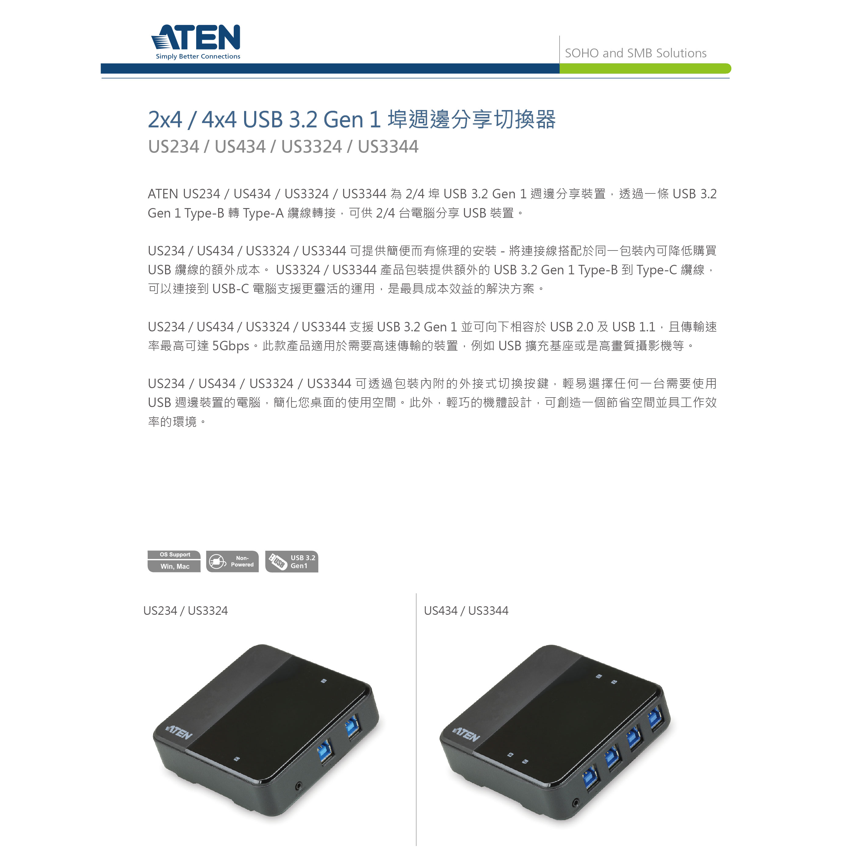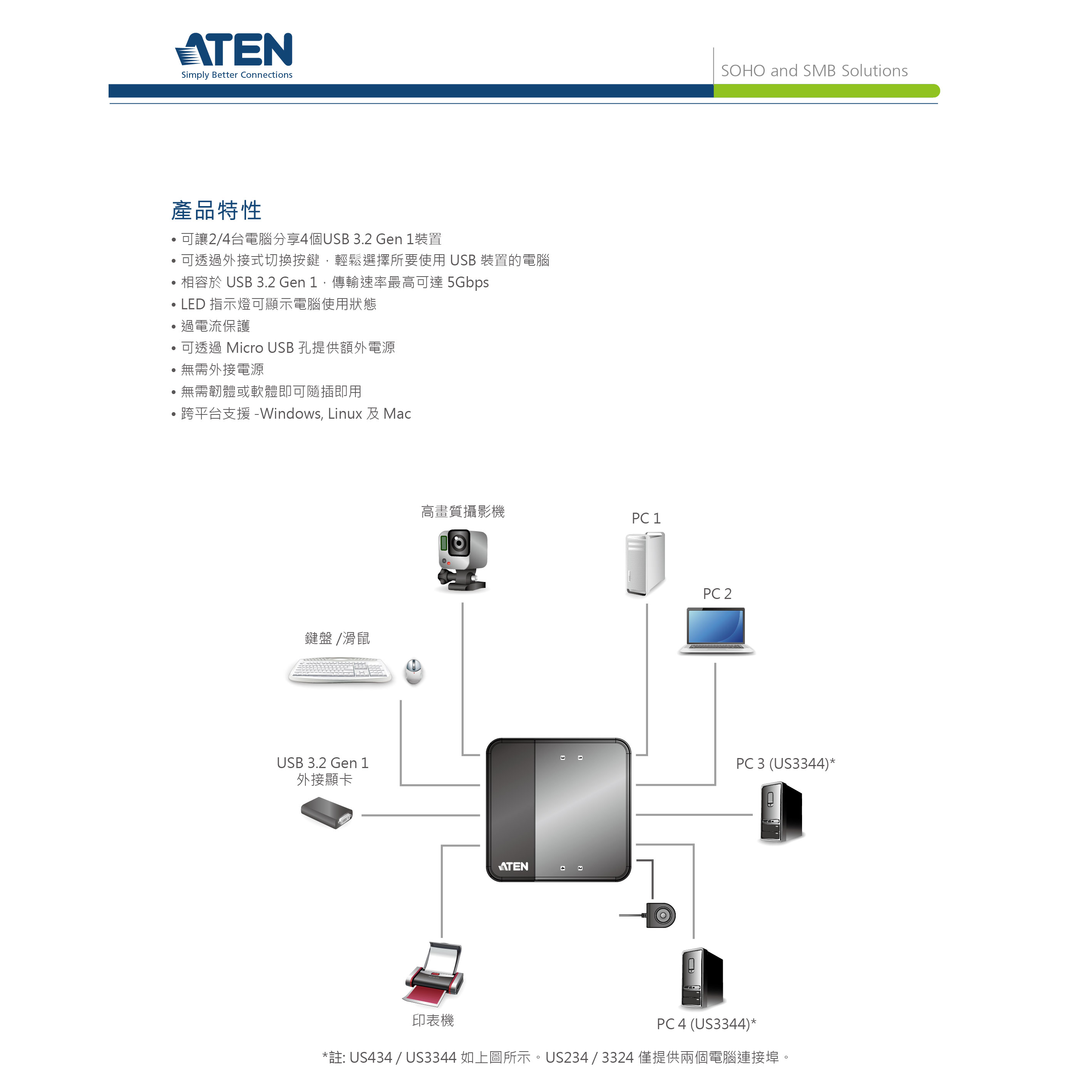 昌運監視器 ATEN 宏正 US3324 2 x 4 USB 3.2 Gen1 週邊分享切換器