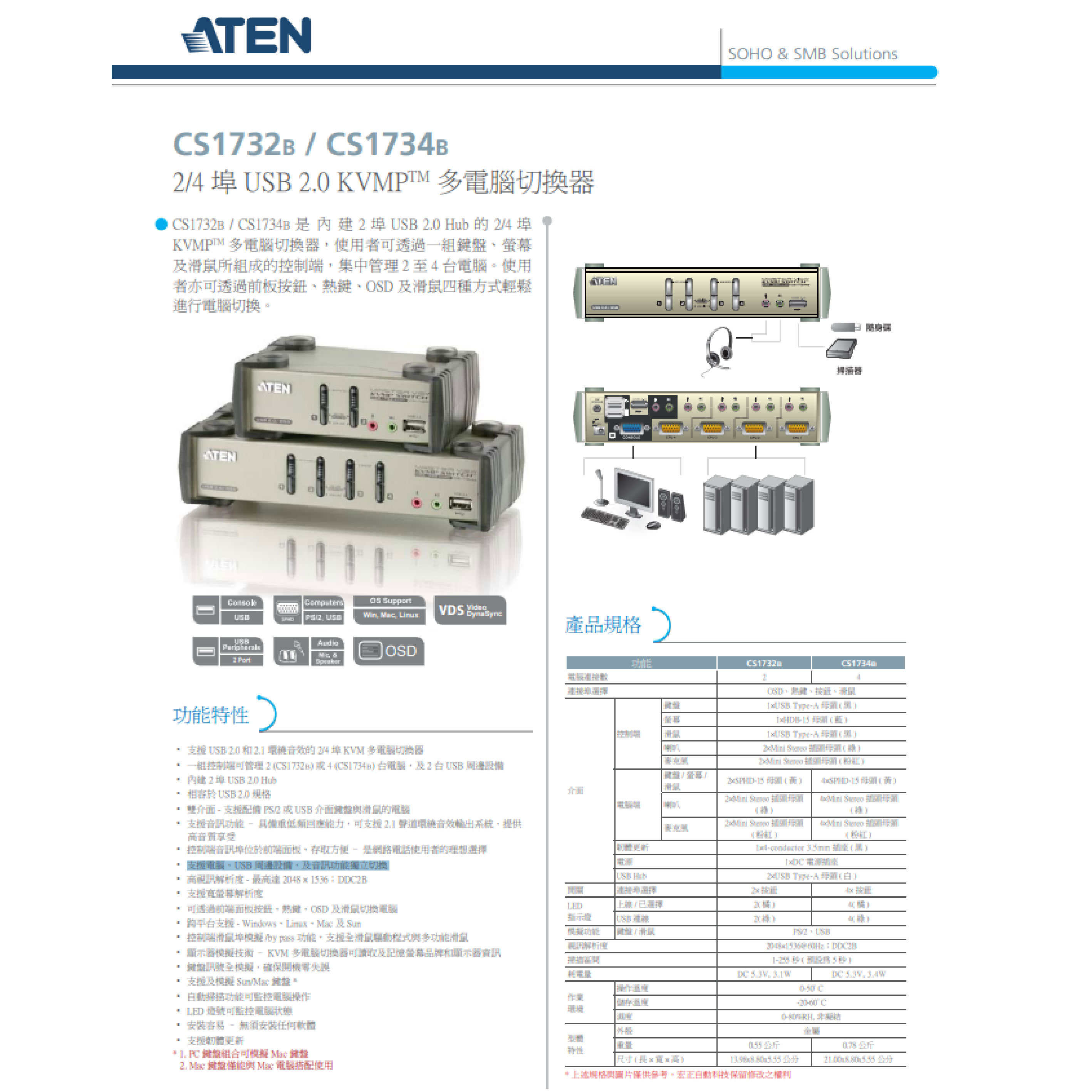 昌運監視器 ATEN 宏正 CS1732B 2埠 PS/2-USB VGA/音訊 KVMP™多電腦切換器