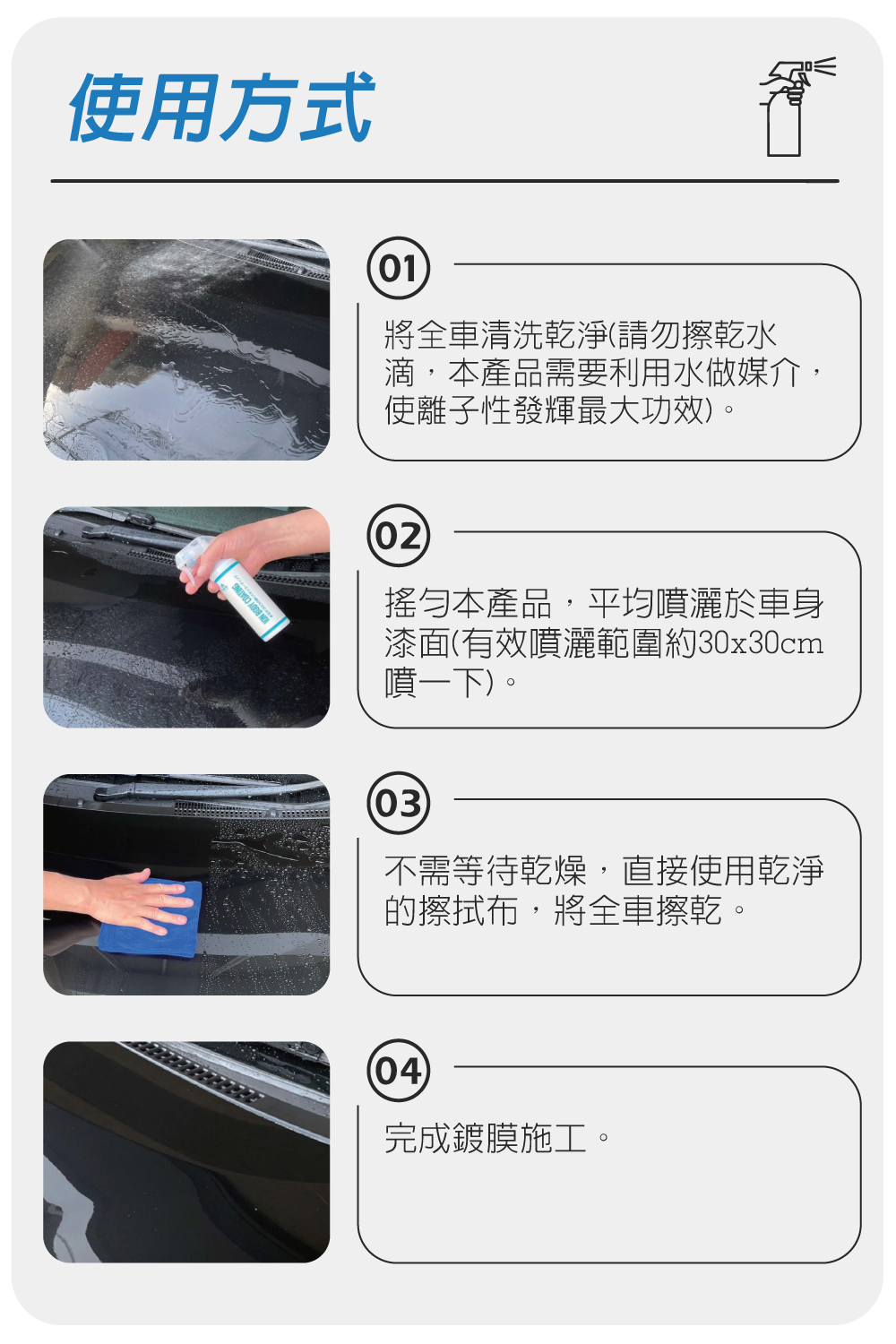 商品介紹‧ 【超撥水性能】鍍膜後,車漆表面會形成一層不沾水的超撥水層,雨天時,水滴快速滑落,不留髒污,不留水痕,效果長達90天。‧ 【超光澤效果】有別於傳統的鍍膜劑,本產品施工後,可呈現出超艷麗的光亮效果,提升漆面色澤,不惹塵,抗酸雨,抗UV,防止金油層老化。‧ 本產品適合所有色系車漆及消光車漆使用。使用方式1.將全車清洗乾淨(請勿擦乾水滴,本產品需要利用水做媒介,使離子性發輝最大功效)。2.搖勻本產品,平均噴灑於車身漆面(有效噴灑範圍約30x30cm噴一下)。3.不需等待乾燥,直接使用乾淨的擦拭布,將全車擦乾,即完成鍍膜施工。規格說明‧ 品名:日本AUG 水離子科技鍍膜‧ 配件:超細纖維布x1‧ 成分:水、異丙醇、亮光撥水劑、氟樹脂、防腐劑‧ 容量:250ml‧ 產地:日本注意事項‧ 車身漆面專用產品,也可使用於汽車玻璃及塑膠表面。‧ 勿於酷熟天氣下施工,並請於通風良好處施工。‧ 請放置陰涼處與兒童不易取到之處。‧ 不可食用,如不慎誤食,請帶著本產品立刻就醫。‧ 施工後請洗手。
