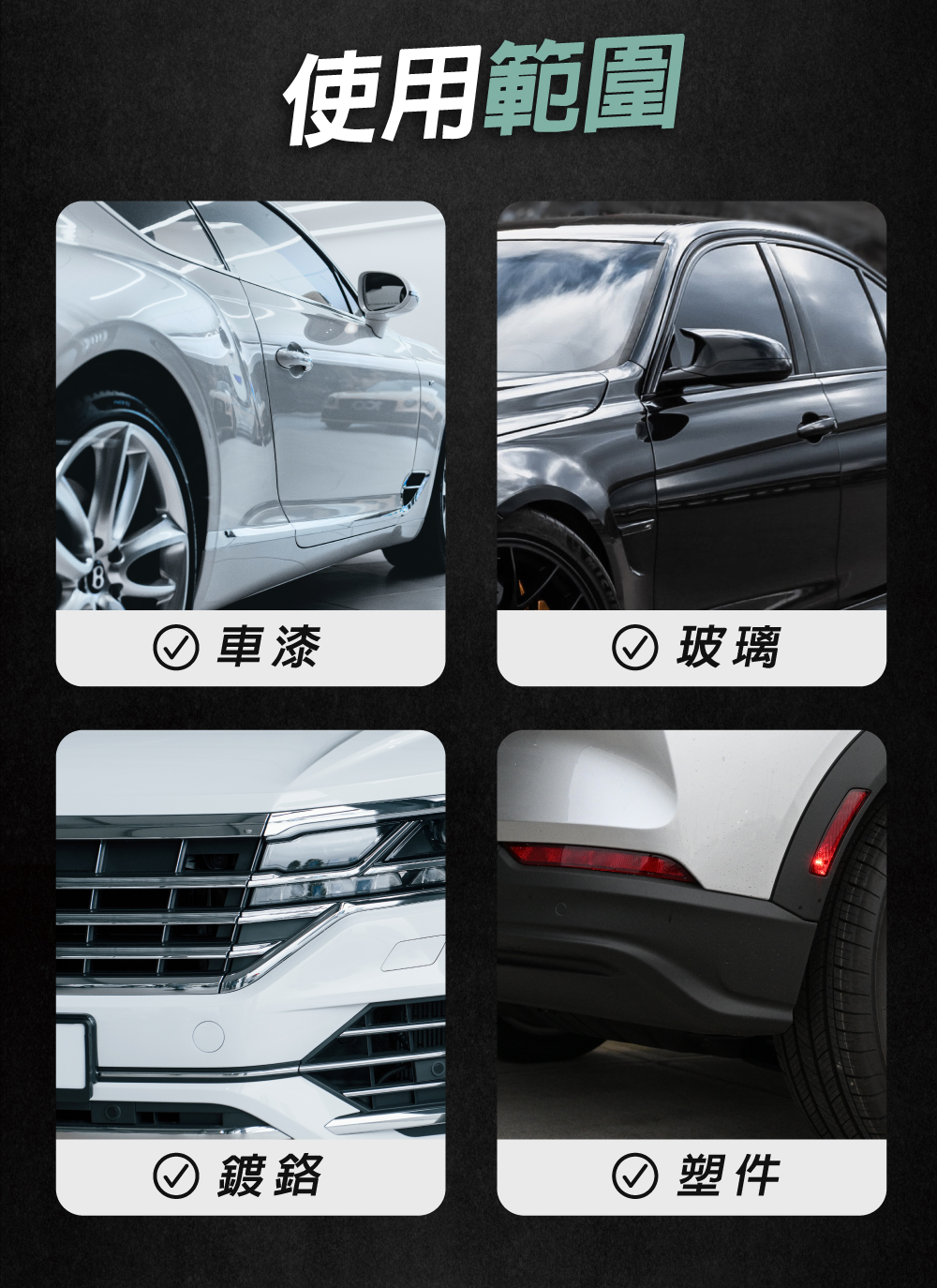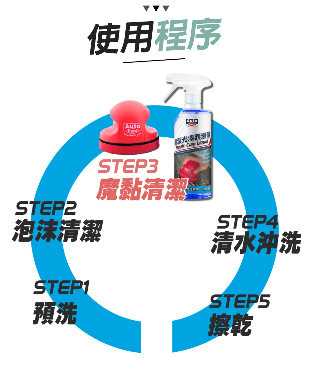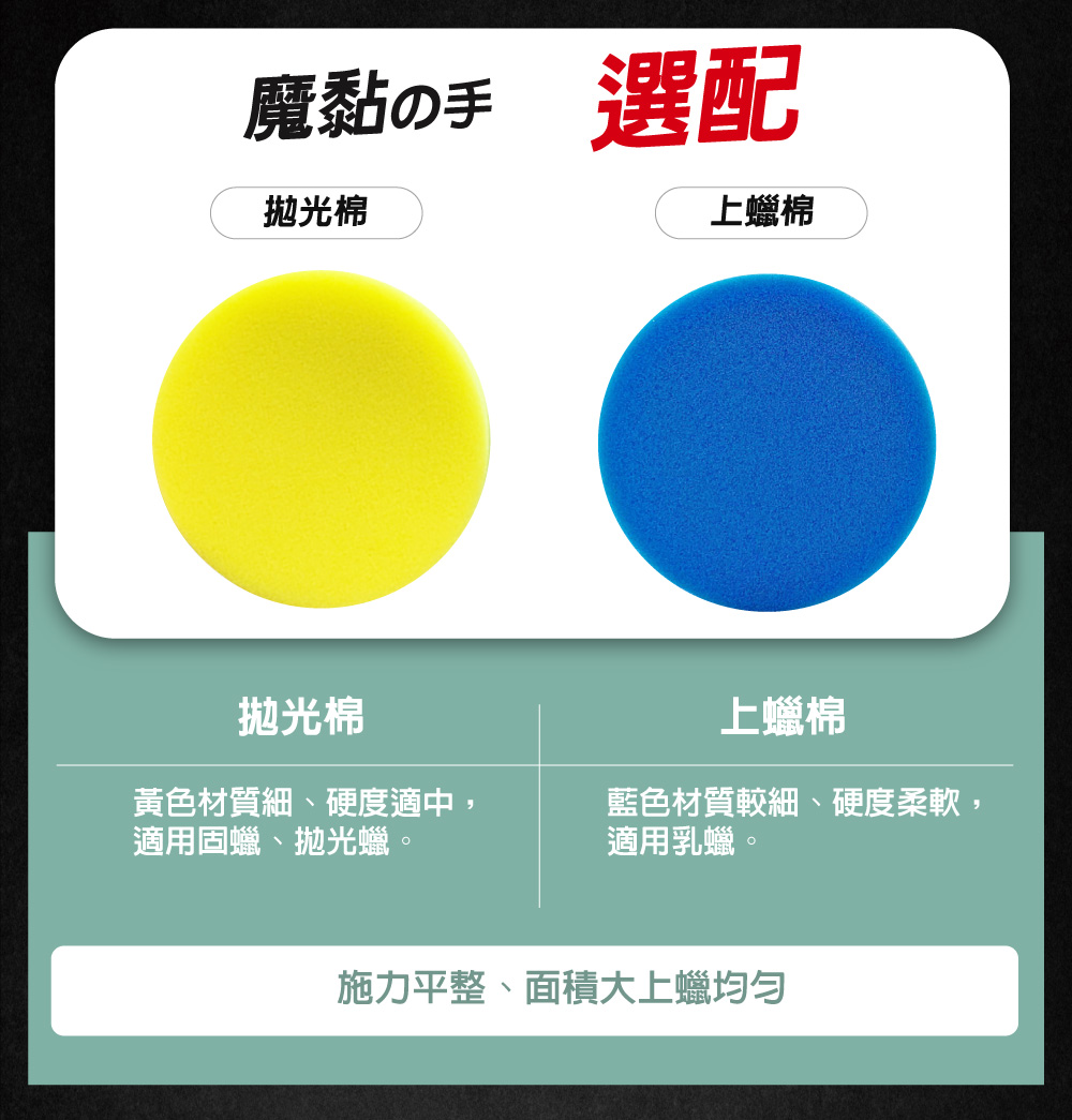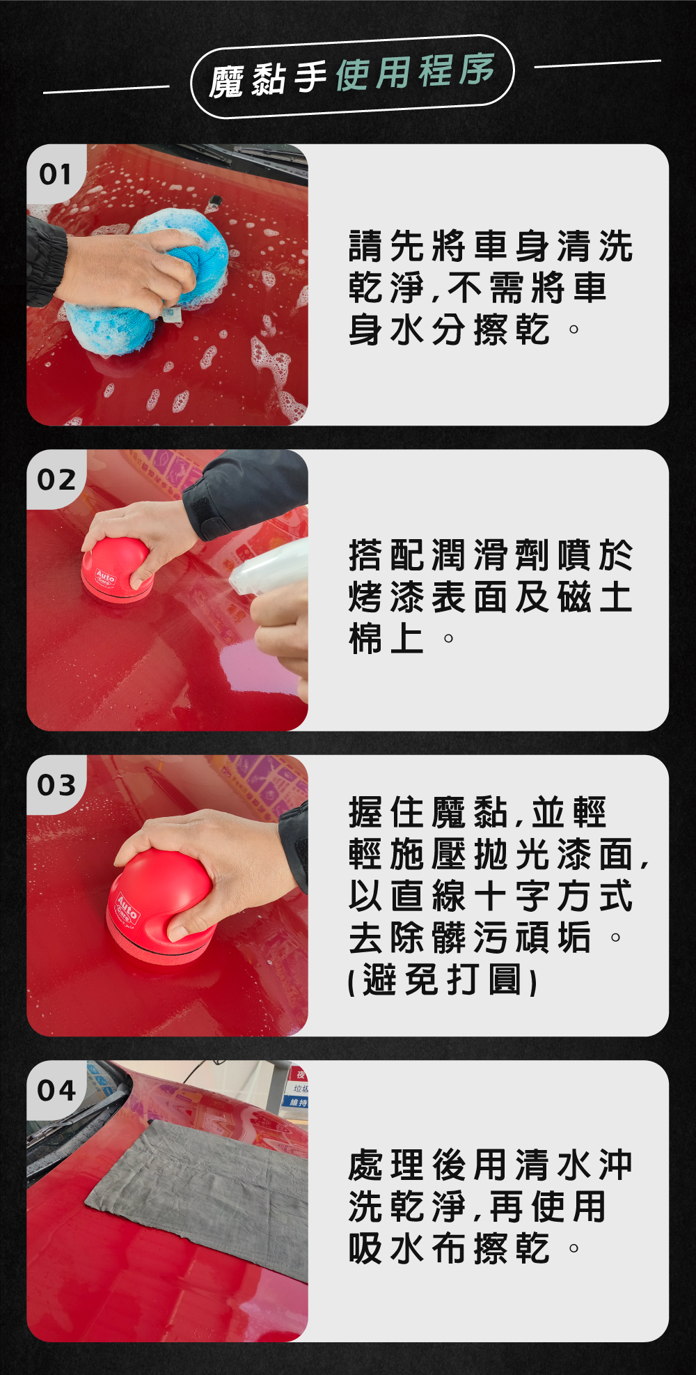 台灣專利創新研發,比美容黏土耐用5倍,最安全有效的美容黏土替代品,符合人體工學設計,高密度聚氨酯握把,輕巧好握易施工。 4吋可拆式魔鬼氈設計可重複使用,方便更換各種棉盤,讓施工變簡單,改善傳統美容黏土耗費時間和體力。 商品介紹 Magic Applicator Pad 魔の手 ‧符合人體工學設計,高密度聚氨酯握把,輕巧好握易施工。 ‧4吋可拆式魔鬼氈設計可重複使用,方便更換。 ‧搭配不同棉盤可發揮各種功能,如魔黏磁土棉、上蠟棉、砂紙。 ‧尺寸:直徑100mX高70mm ‧顏色:紅 ‧成分:高密度聚氨酯 Magic Clay Pad 魔黏磁土 ‧比美容黏土耐用5倍,最安全有效的美容黏土替代品。 ‧讓施工變簡單,改善傳統美容磁土耗費時間和體力。 ‧4吋魔黏磁土墊易拆,操作面積大,容易施工。 ‧專利奈米複合膠,獨家圓點設計更安全/平面設計提高去除力。 ‧去除鐵粉、飛漆、頑垢、蟲屍、鳥屎。 ‧建議使用20台車以上就必須拋棄。 ‧尺寸:直徑105mmX高15mm ‧顏色:紅 ‧成分:奈米複合膠、高密度聚氨酯 Car Wax Applicator Pad 上蠟棉 ‧4吋高密度發泡海棉,取蠟容易。 ‧15mm厚度最適合手動上蠟使用。 ‧魔鬼氈設計易拆,複合黏膠不脫膠。 ‧施力平整,面積大上蠟均勻。 ‧藍色材質較細、硬度柔軟,適用乳蠟。 ‧尺寸:直徑105mmX高15mm ‧顏色:藍 ‧成分:高密度聚氨酯 Polishing Sponge Pad拋光海綿 ‧4吋高密度發泡海棉,取蠟容易。 ‧15mm厚度最適合手動上蠟拋光使用。 ‧魔鬼氈設計易拆,複合黏膠不脫膠。 ‧施力平整,面積大上蠟均勻。 ‧黃色材質細、硬度適中,適用固蠟、拋光蠟。 ‧尺寸:直徑105mmX高15mm ‧顏色:黃 ‧成分:高密度聚氨酯 Magic Clay Liquid魔潔光澤潤滑劑 ‧新聚合物配方,泡沫感提升,清潔漆面潤滑度高,不易產生刮傷。 ‧烤漆光澤配方,讓烤漆清潔後,光澤感提升。 ‧清潔力增強,搭配工具能有效清除烤漆表面的鐵粉、汙垢、飛漆。 ‧烤漆保養前的大清潔,讓你的保養效果加倍。 ‧推薦搭配:魔黏の手、美容磁土、魔泥磁土布,發揮最大的清潔美容效果。 規格說明 ‧品牌:Auto Care ‧品名:魔黏の手 ‧組合內容:魔の手*1、魔黏磁土(平面)OR (圓點)*1個 ‧產地:台灣 規格說明 ‧品牌:Auto Care ‧品名:魔黏の手+魔潔光澤潤滑劑 ‧組合內容:魔の手*1、魔黏磁土*1個、魔潔光澤潤滑劑600ml*1瓶 ‧產地:台灣 使用方法 去鐵粉使用程序 1.請先將車身清洗乾淨,不需將車身水分擦乾。 2.搭配魔潔光澤潤滑劑噴於烤漆表面及磁土棉上。 3.握住魔黏,並輕輕施壓拋光漆面,避免打圓,去除髒污頑垢。 4.處理後用清水沖洗乾淨,再使用吸水布擦乾。 上蠟使用程序1.黃色拋光棉適合沾取固蠟。 1.藍色上蠟棉適合搭配乳蠟使用。 2.均勻塗抹烤漆面上。 3.再使用超細纖維布擦亮。 注意事項 ‧ 嚴禁與石油系清潔劑、溶劑類混合使用(如柏油清潔劑、鐵粉去除劑或清潔蠟)。 ‧ 嚴禁長時間置於40℃以上高溫處。‧ 避免鈑金處於高溫下施工。 ‧ 膠面嚴重污染髒污、脫膠沾污,請立即更換新品,以免刮傷車漆。 ‧ 使用後用清水沖洗魔黏磁土棉並放在陰涼乾燥的地方儲存。‧ 保存方式:室內陰涼處通風處 常見Q&A Q1.魔黏磁土棉只能使用在烤漆嗎? A1.玻璃、燈殼、外部塑件、鍍鉻飾條都能使用! 因鋁圈鐵粉比較不好處理,鋁圈建議使用鐵粉去除劑。 Q2.飛漆、柏油能去除嗎? A2.水性飛漆可以去除,若被濺到的範圍太大,建議使用塗鴨去除劑。柏油黑點 (已經固化狀態)可以去除,若是剛被噴到柏油,建議使用柏油去除劑,以免使用 魔黏の手把整片板金搞糊了。 Q3.可以去除水痕嗎? A3.剛形成的水痕水漬可以去除,若是已經形成一段時間的則無法, 需要使用Willson去污撥水光澤蠟處理。 Q4.棉與魔鬼氈之間會不會容易脫膠? A4.台灣專利奈米複合膠技術,在使用後清洗揉擰時不容易脫膠, 德國進口棉相當耐拉扯。 Q5.使用時需要注意什麼? A5.魔黏磁土棉絕對不能與鐵粉去除劑、柏油去除劑等等... 這類的石油系溶劑一起使用,否則容易溶解磁土就得汰換。 06.使用後該怎麼存放? A6.魔黏磁土棉使用後用清水沖乾淨,放在陰涼處存放即可,磁土面不要朝下。 拋光棉、打蠟棉使用後搭配除蠟劑洗乾淨,一樣放在陰涼處陰乾即可。 Q7.何時替換魔黏磁土棉? A7.1.圓點抹平2.表面破損 3.使用時膠會黏在車漆上4.使用20台車以上