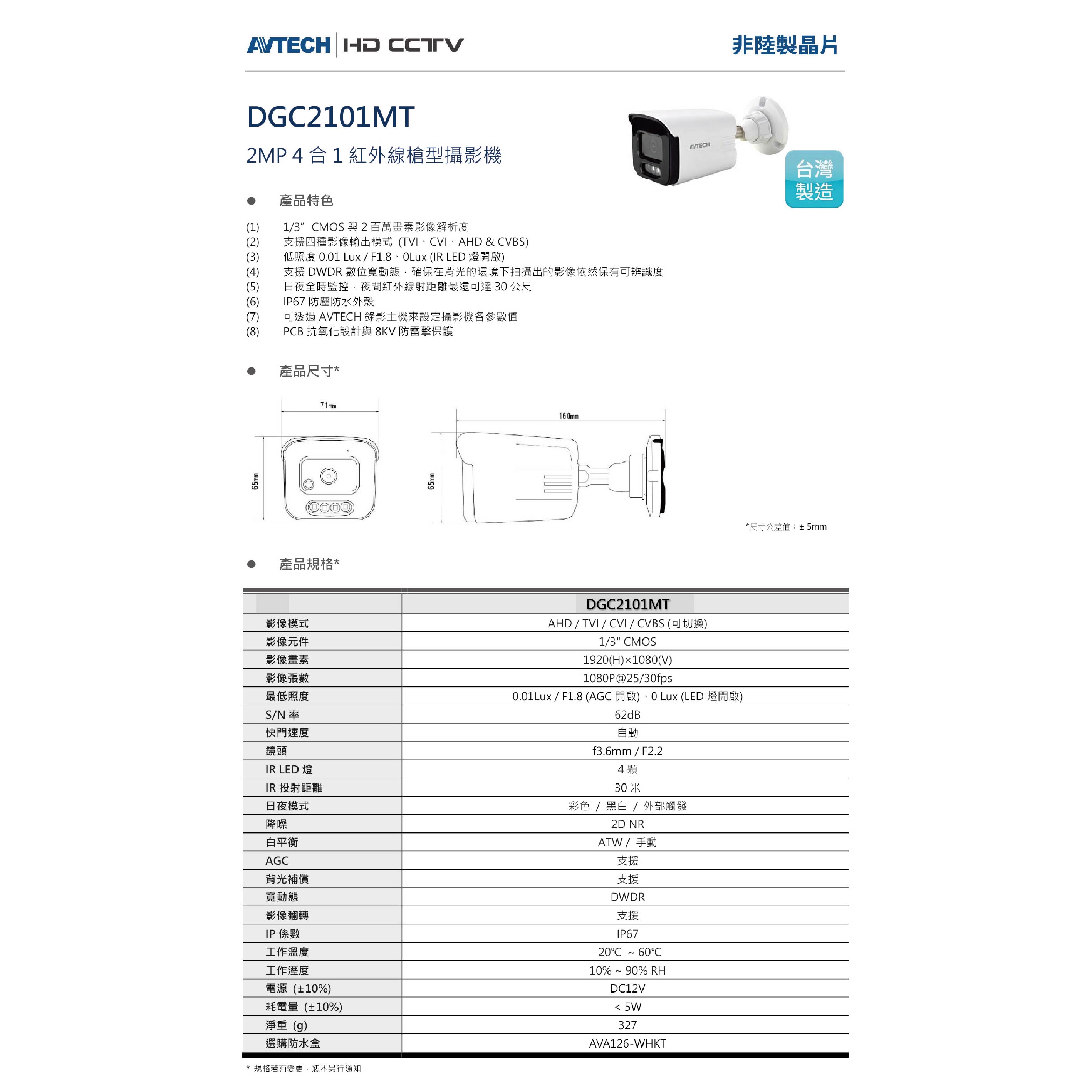 昌運監視器 AVTECH陞泰 DGC2101MT 200萬畫素 4合1紅外線槍型攝影機