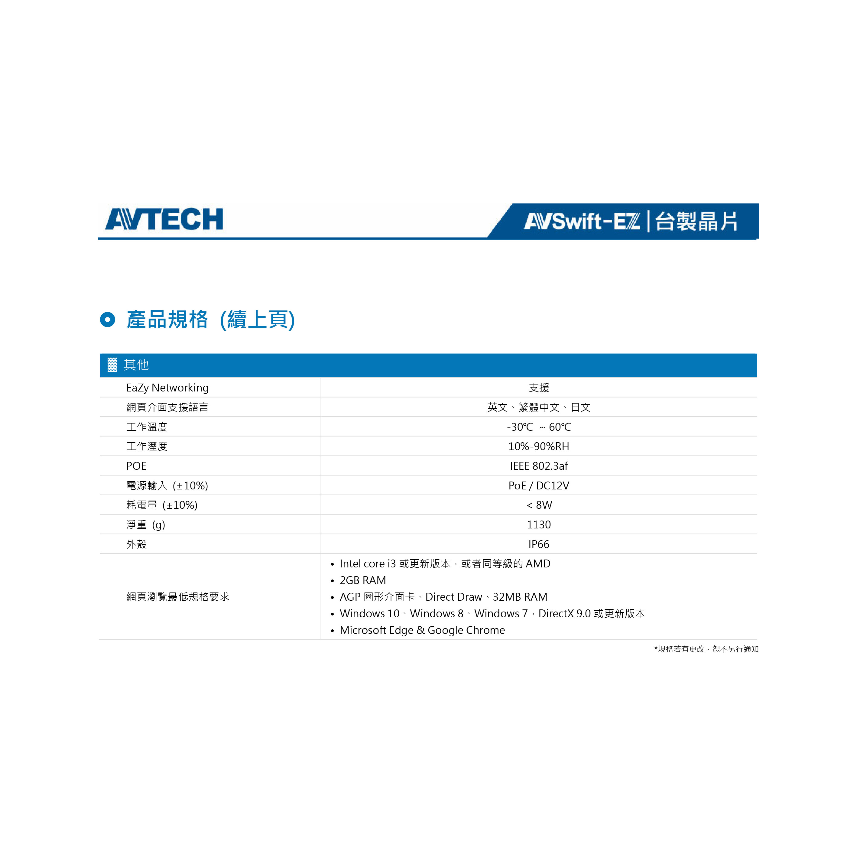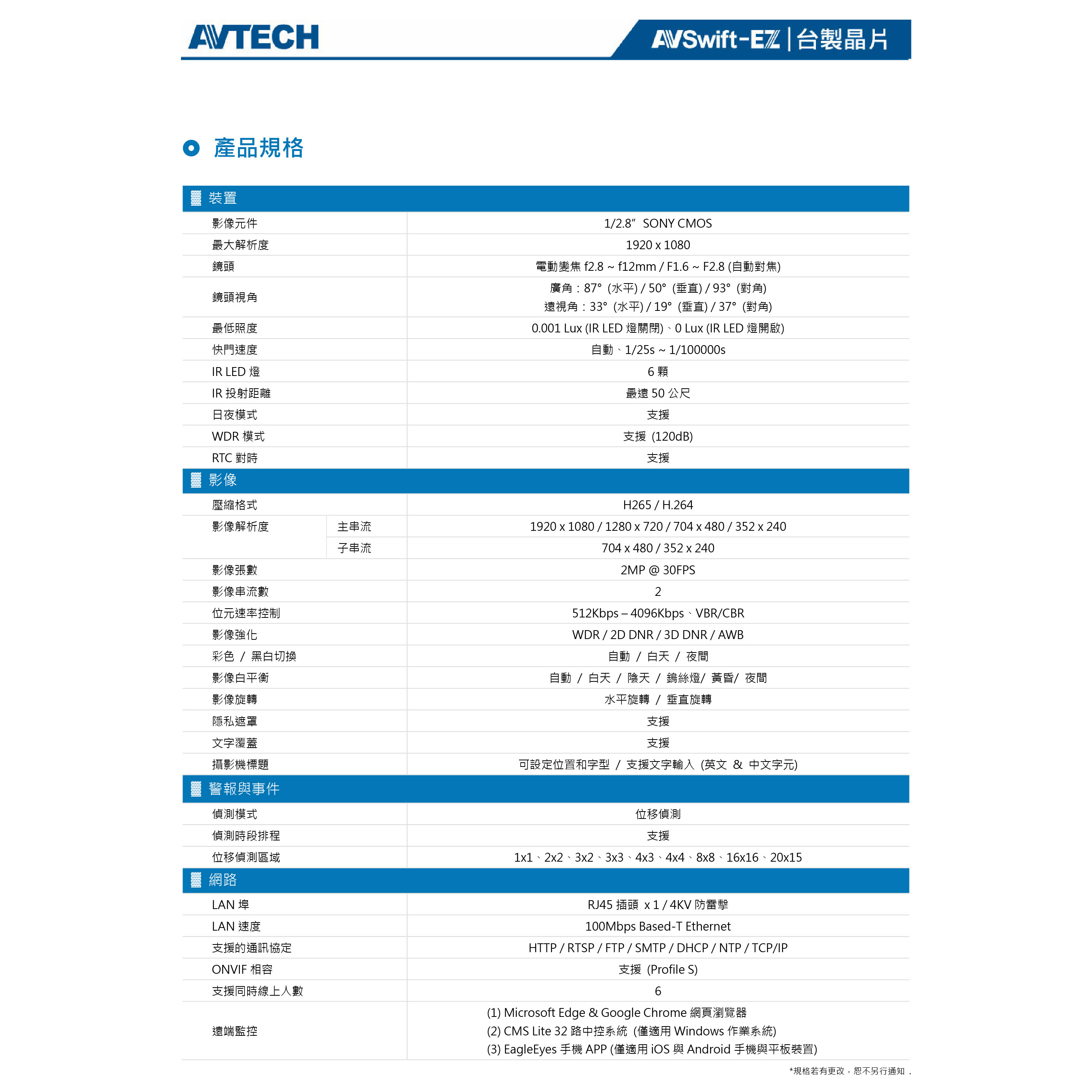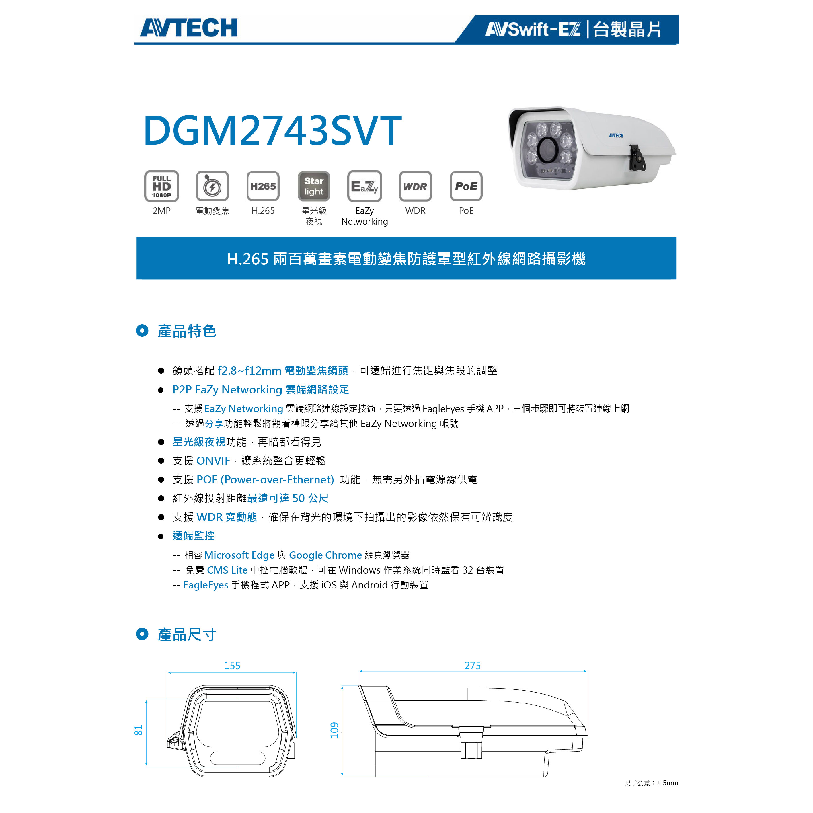 昌運監視器 AVTECH陞泰 DGM2743SVT 200萬畫素 電動變焦防護罩型紅外線網路攝影機 星光級夜視功能