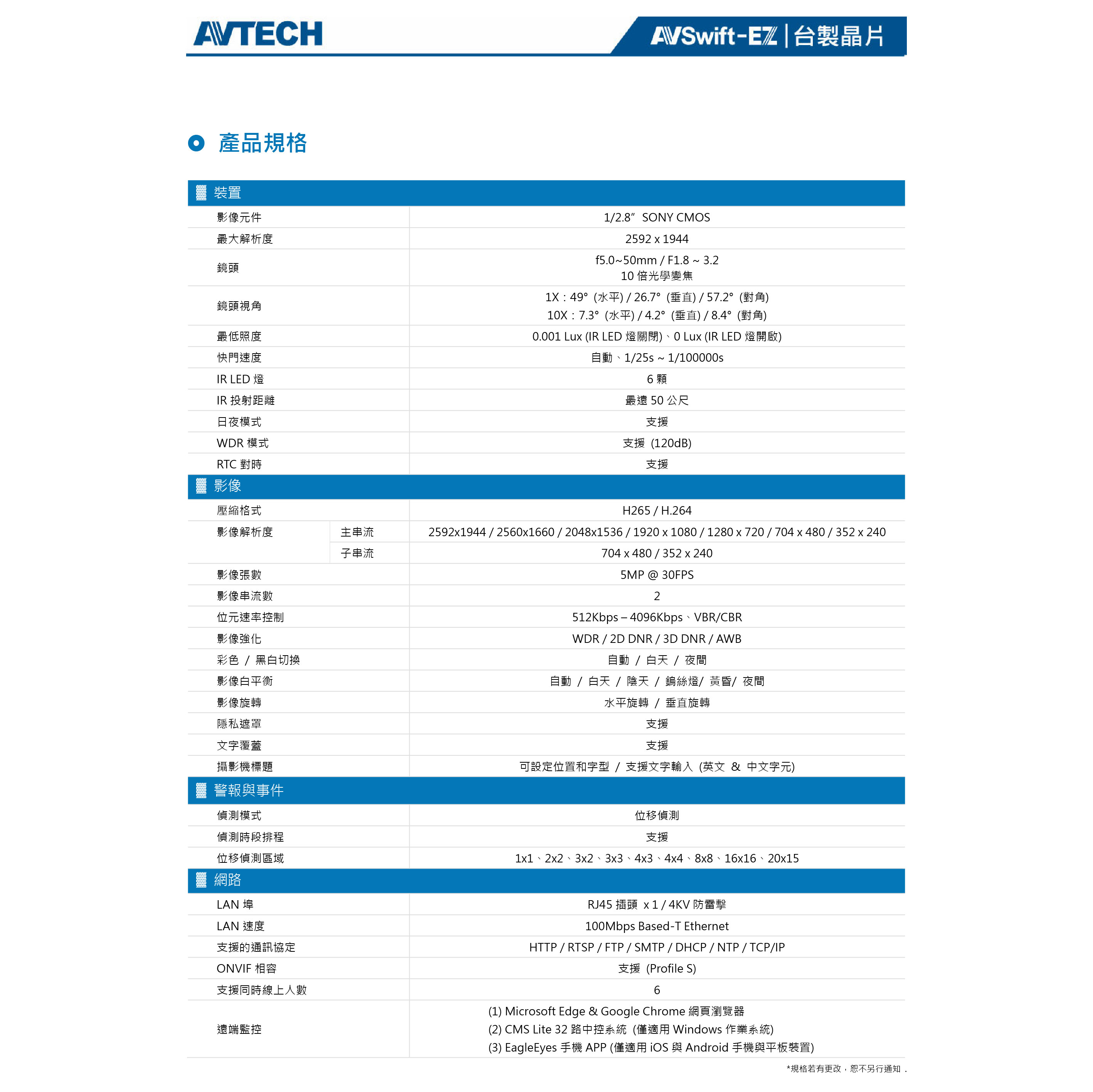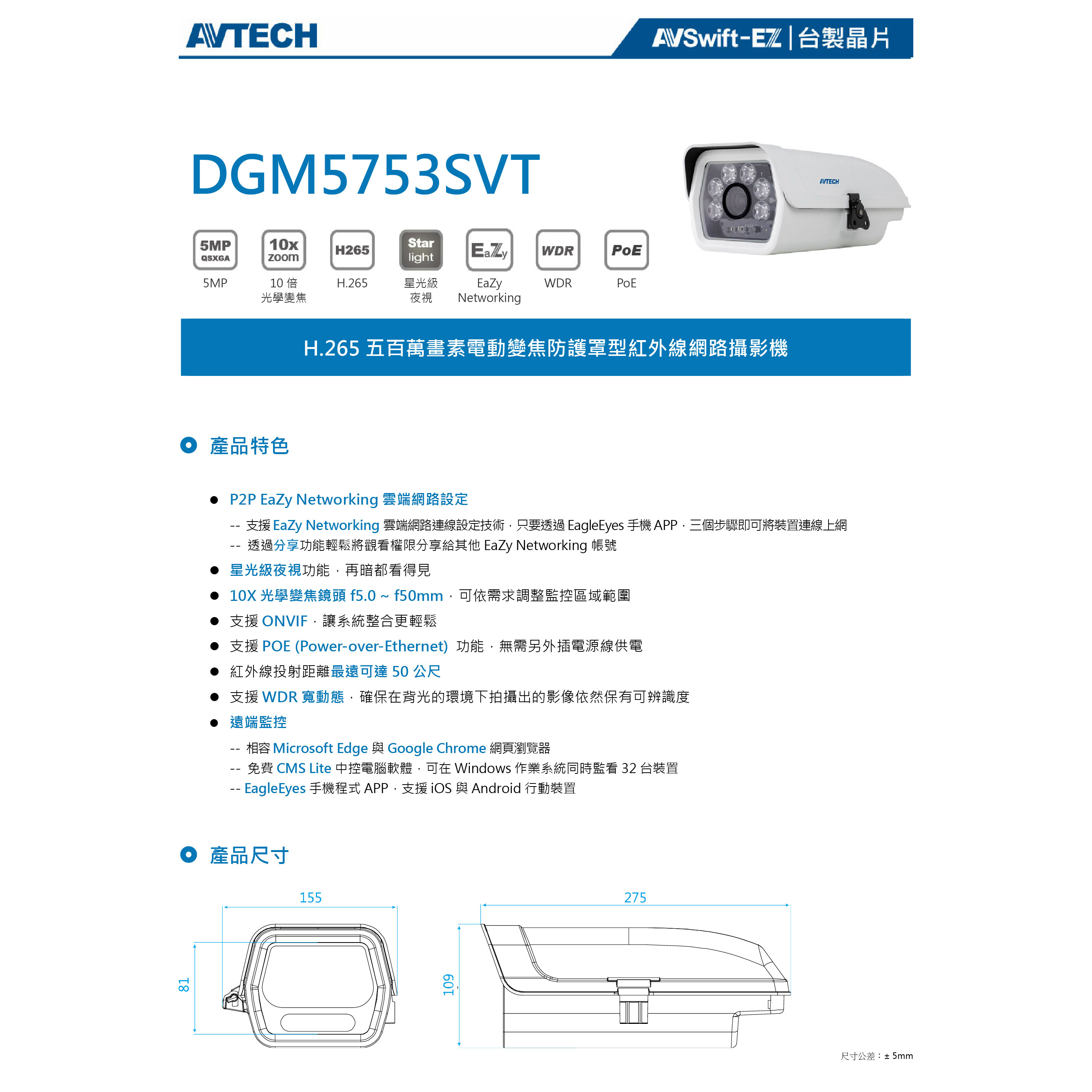 昌運監視器 AVTECH陞泰 DGM5753SVT 500萬畫素 電動變焦防護罩型紅外線網路攝影機