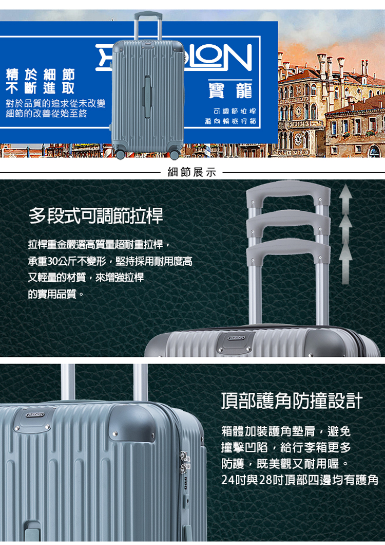 ◆尺寸(長*厚*高,含輪高):20吋/約34*29*54.5cm、24吋/約39.5*32*65cm、28吋/約45.5*37*75.5cm