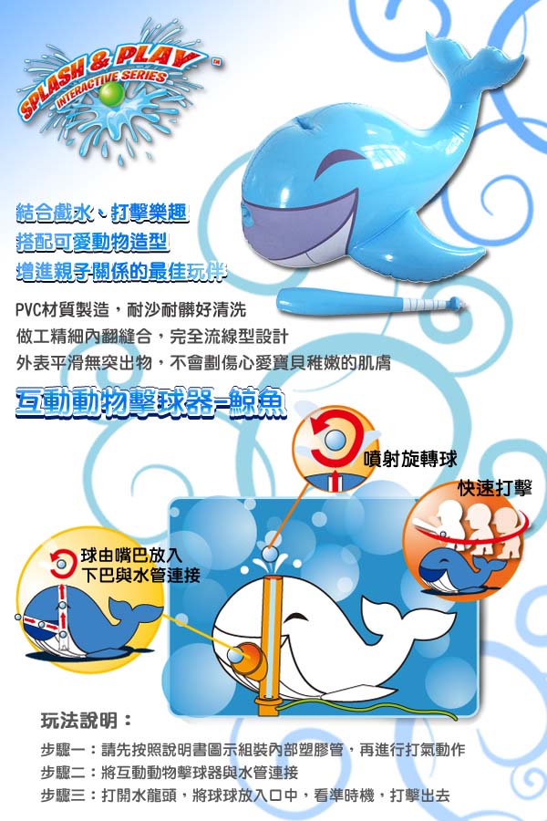 內容物: 組裝說明書,彩色球3入,充氣球棒1入,互動動物擊球器1組(含內部組裝水管),5cmx5cm修補片1張