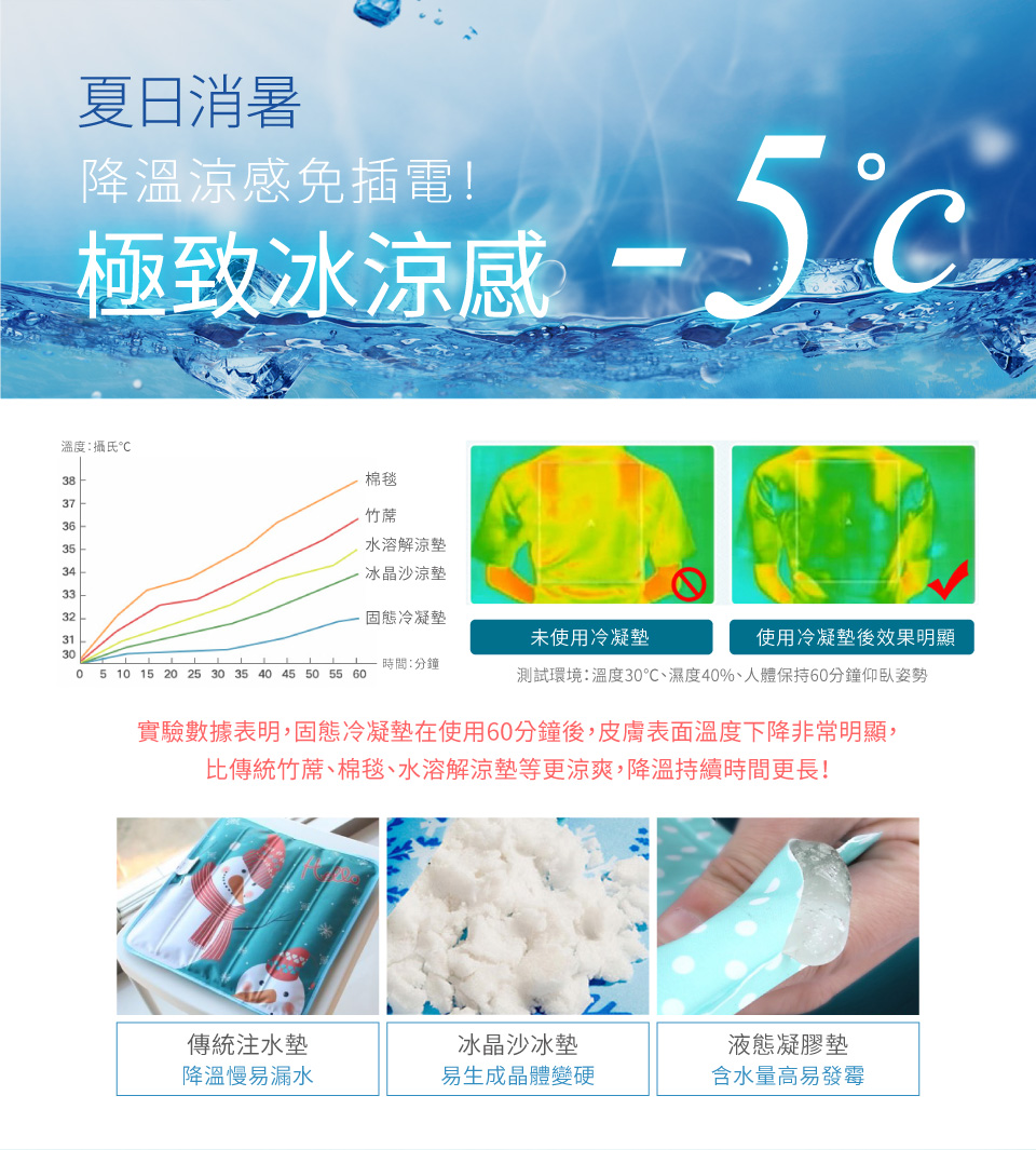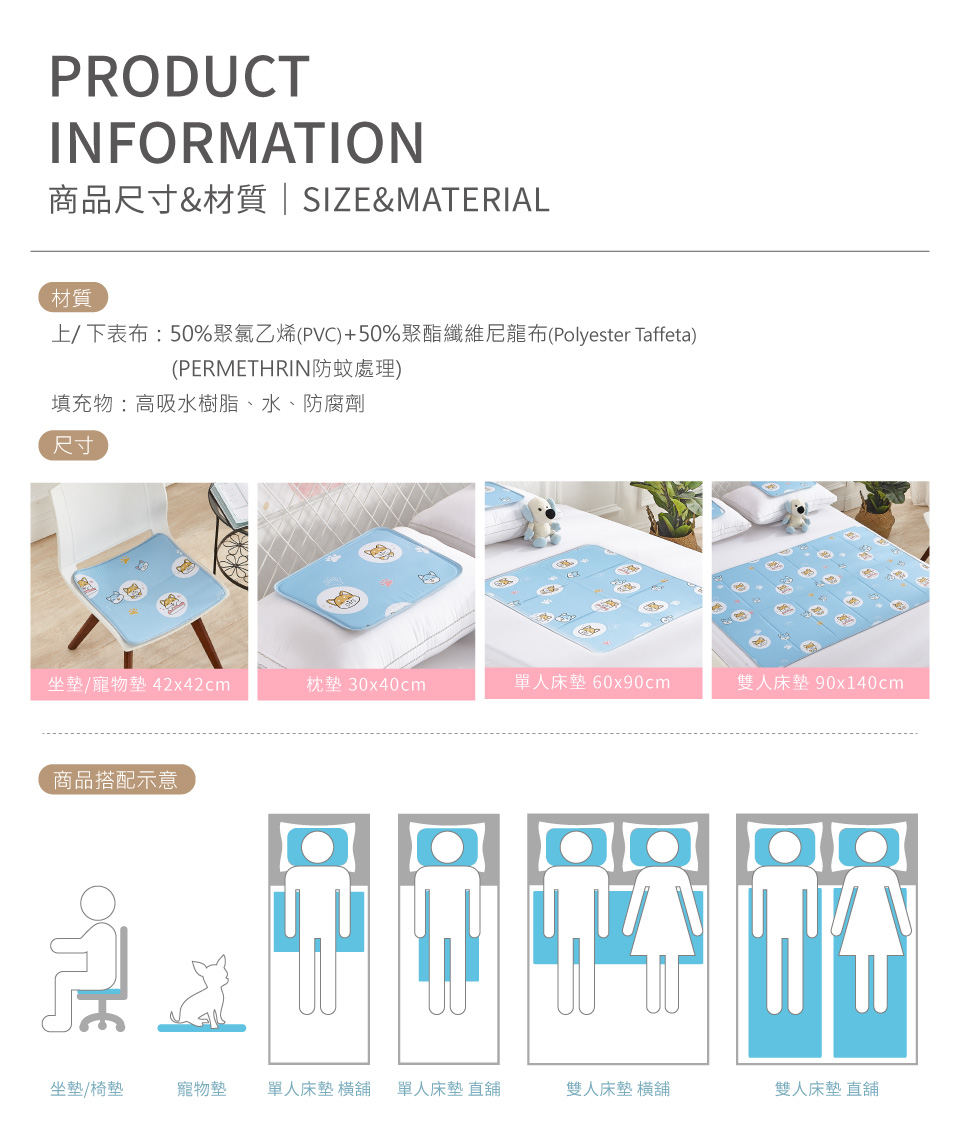 ◆ 產品內容/材質◎表布/底布:50%聚氯乙烯(PVC)+50%聚酯纖維尼龍布(PERMETHRIN防蚊藥劑處理)•填充物:100%涼感固態凝膠(高吸水樹脂,水,防腐劑)•尺寸― 雙人床墊 90x140cm 枕墊30x40cm•重量-雙人床墊6460g 枕墊700g