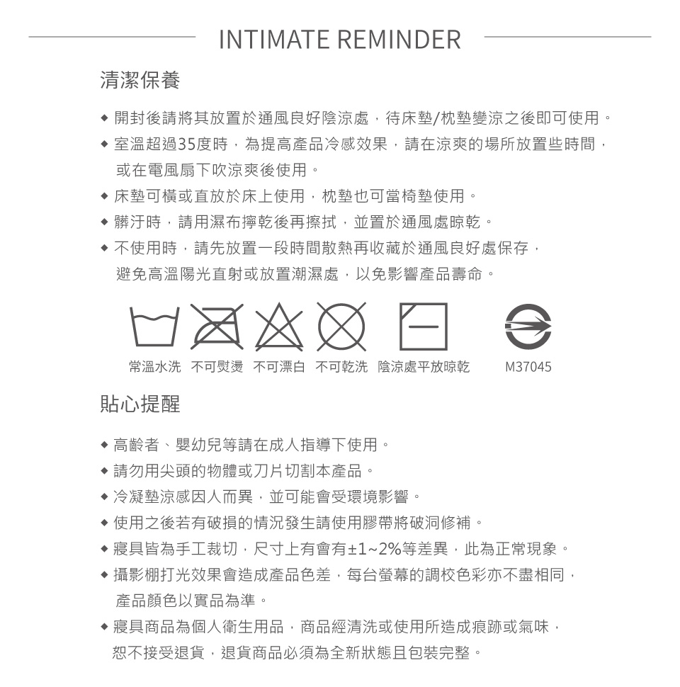 •數量-雙人床墊1入 枕墊2入•顏色-如產品圖示,網頁圖片因拍攝關係,與實品略有差異,實際顏色以出貨為主清潔保養方式-不可水洗/不可漂白/不可熨燙/可以濕布擦拭/陰涼處平放晾乾1.開封後請將其置放於通風良好的陰涼處,待床墊或枕墊變涼之後即可使用2.室溫超過35度時,為提高產品冷感效果,請在涼爽的場所放置些時間,或在電風扇下吹涼爽後使用。3.床墊可橫或直放床上使用,枕墊也可當椅墊使用4.不使用時請將床墊放置在通風良好處保存。5.高齡者、嬰幼兒等請在成人指導下使用。6.請勿用尖頭的物體或刀片切割本產品。7.不可清洗,若附著髒汙時,請用濕毛巾擦拭◆注意事項:.注意事項一:商品如經拆封、使用過、清洗過或拆解以致缺乏完整性及失去再販售價值時,恕不接受退換貨!.注意事項二:此商品圖為參考用之情境圖示,產品內容以規格敘述內容為準.注意事項三:因布料裁切位置的不同,部份花版可能會與商品圖略有出入,請以收到的實品為主,網頁圖片因拍攝與螢幕解析度關係,與實品略有差異,實際顏色以出貨為主.注意事項四:商品若欲辦理退款依法需先恢復商品原狀,否則需支付恢復商品原狀之費用方得辦理退款。(新品瑕疵除外)。.注意事項五:商品退換貨,需有外包裝破壞袋包覆,如商品提袋包裝汙損將無法退換貨,需另補償整新費。.注意事項六:為了保障雙方權益,請在拆封過程中務必全程錄影,以確保商品是否遺漏、缺貨、瑕疵品(商品缺件、汙漬)等,包裹/商品有問題請於7天商品鑑賞期內,附上完整錄影檔為依據告知,逾期恕不予受理!.注意事項七:送達地點有否限制:限台灣本島地區,外島恕不接單