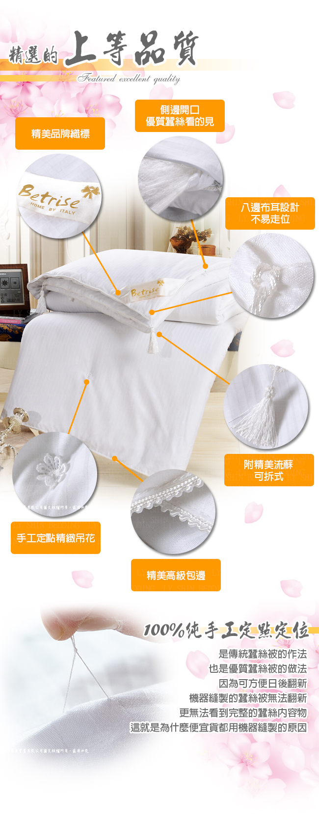 ☆採用特級精梳棉緹花表布 ☆100%純天然長纖蠶絲 ☆手工拉絲,手釘線 ☆冬暖夏涼˙高保暖性