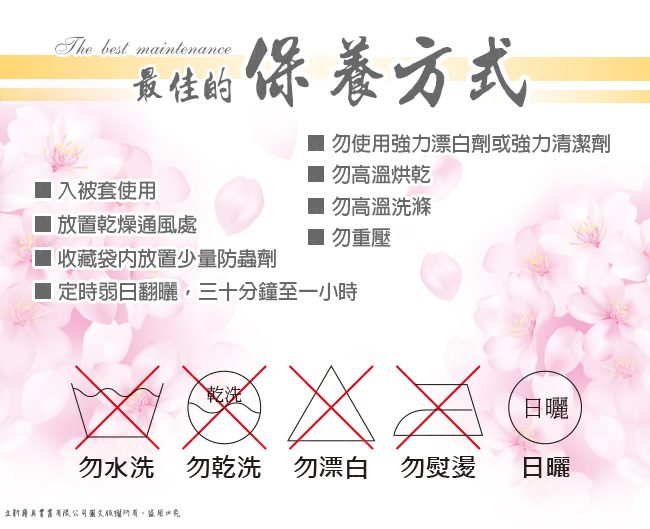 ◆清潔保養方式:1.適合乾洗,切忌水洗以免被胎變形,並請交由專業洗衣店處理2.建議在下午3點溫和陽光下,加入被套曬1至2小時,可達到消毒,去溼及殺菌之效果,可恢復彈性,延長使用期限.3.若沾染污漬,可使用中性洗劑先做局部清洗,再送至專業洗衣店處理.4.不可水洗及烘乾.5.換季時請使用包裝袋收藏,請勿壓縮,放置於通風處即可.◆縮率和色牢度:縮率3% 色牢度4級◆退貨條件:除商品本身有瑕疵可辦理退貨,商品一經使用或損毀即不可退換貨,退貨必須保留紙箱及商品組合之齊全及完整性。◆商品退換貨,需有外包裝破壞袋包覆,如商品提袋包裝汙損將無法退換貨,需另補償整新費。◆送達地點有否限制:限台灣本島地區,外島恕不接單。