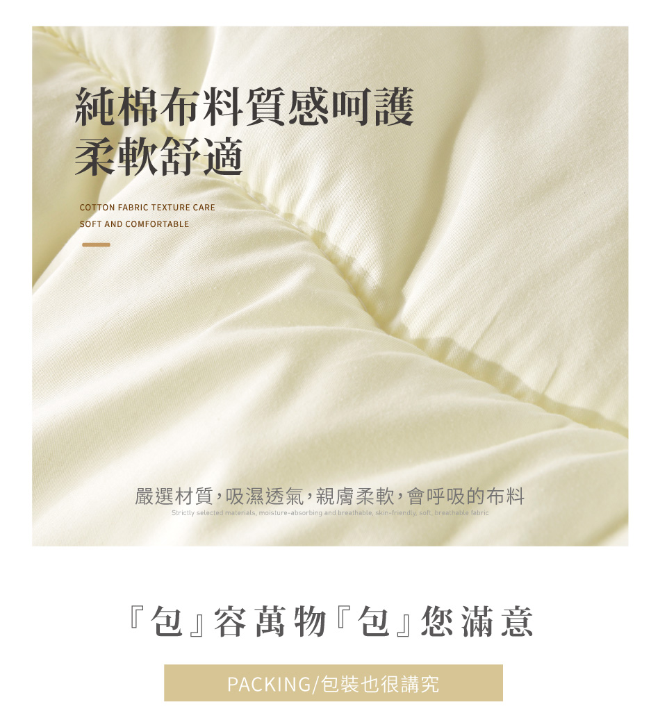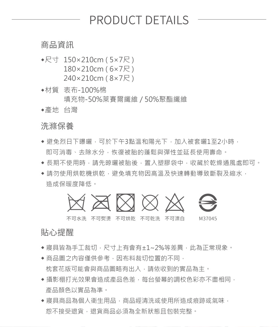 ◆清潔保養方式:1.建議在下午3點溫和陽光下,加入被套曬1至2小時,可達到消毒,去溼及殺菌之效果,可恢復彈性,延長使用期限。2.若沾染污漬,可使用中性洗劑先做局部清洗,再送至專業洗衣店處理.3.不可水洗及烘乾。4.換季時請使用包裝袋收藏,請勿壓縮,放置於通風處即可。◆退貨條件:除商品本身有瑕疵可辦理退貨,商品一經使用或損毀即不可退換貨,退貨必須保留紙箱及商品組合之齊全及完整性。◆商品退換貨,需有外包裝破壞袋包覆,如商品提袋包裝汙損將無法退換貨,需另補償整新費。◆送達地點有否限制:限台灣本島地區,外島恕不接單。