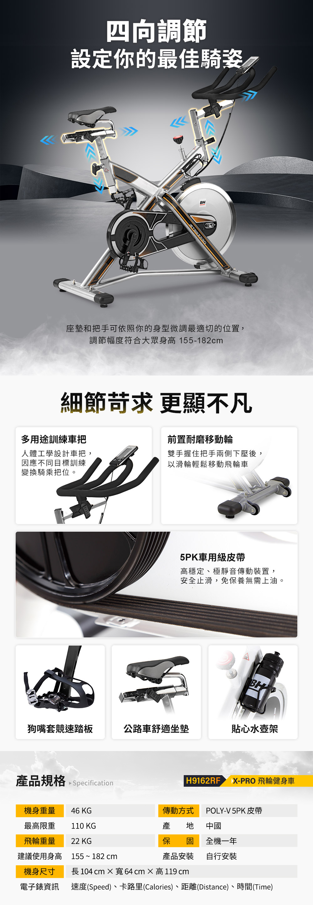▲X型強化支撐高鋼性車架▲健身房級22KG鑄鐵飛輪▲全方位靜電導流 維持電位平衡▲無段式阻力旋鈕調整▲靜音安全POLY-V 5PK皮帶▲車身四向調節,設定最佳騎姿