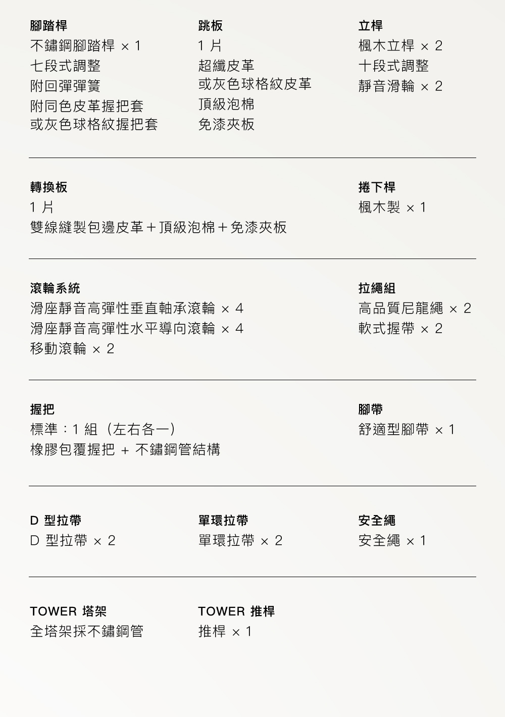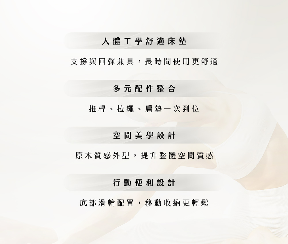 ▲推桿、拉繩、肩墊多元配件整合