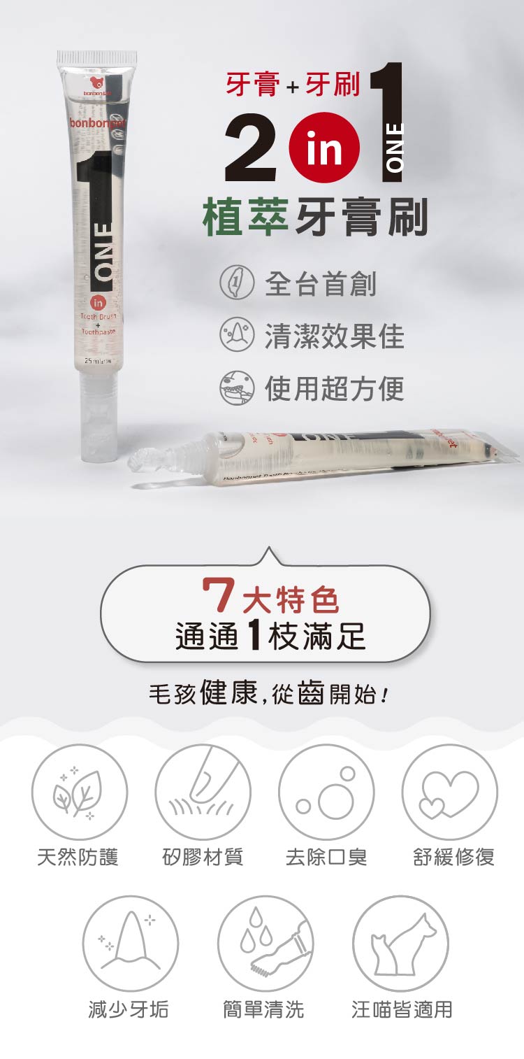 不用擔心不受控的狗狗喵喵怎麼刷牙!!獨立幫毛孩刷牙超Easy~使用天然甘草及烏龍茶萃取,毛孩舔到也不擔心~ ═══ MIT 台灣製造,好安心 ═══ ❶ 牙膏即牙刷|使用超 Easy ❷ 減少牙垢|甘草及烏龍茶萃取 ❸ 去除口臭|柿子萃取+蜂膠 ❹ 口腔黏膜保濕|醣基海藻糖 ❺ 安全刷毛|矽膠柔軟而耐咬 ❻ 簡單清洗|避免壞東西孳生 ❼ 汪喵適用|適合不同體型毛孩 ●單支有效期限在彩色卡片上,建議毛拔麻請不要丟喔!