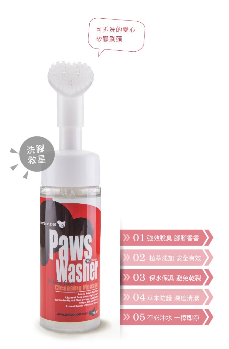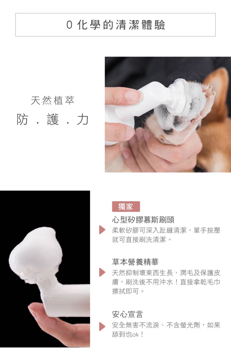 ◎ 首創愛心造型矽膠慕斯刷頭,單手按壓就可直接刷洗清潔,超方便!◎ 草本營養精華成分,刷洗後不用沖水!直接拿乾毛巾擦拭即可◎ 瞬間除臭效果超好!針對趾縫或寵物局部清潔,潤毛及保護皮膚◎ 看得見的髒污,只要輕輕刷,通通清潔溜溜◎ 安全無害不流淚、不含螢光劑,如果舔到也ok!◎ 如果是6個月以下的毛孩,使用後一定要吹乾喔,因為他們還小,吹乾可以避免著涼喔