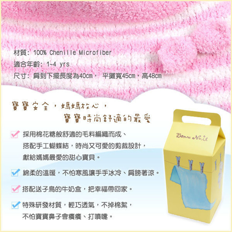 特殊研發材質,輕巧透氣,不掉棉絮 寶寶安全,媽咪放心 Bonne Nuit Baby 棉花糖寶寶披風肩到下擺長度為40cm,平攤寬45cm,高48cm材質: 100% Chenille Microfiber適合年齡: 1到4歲產地 : 台灣
