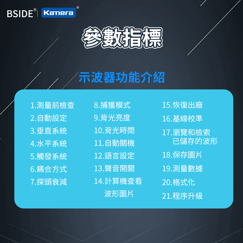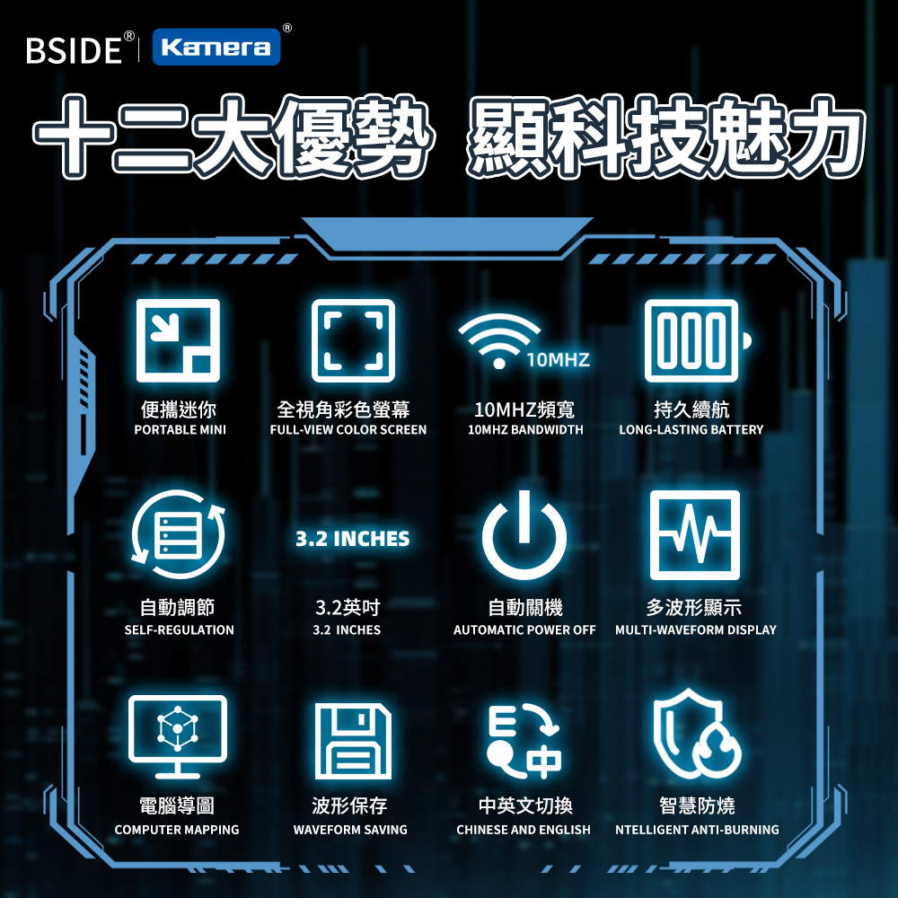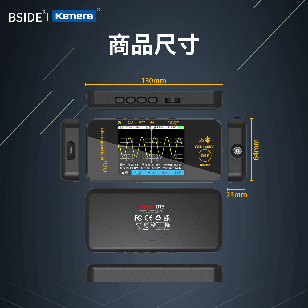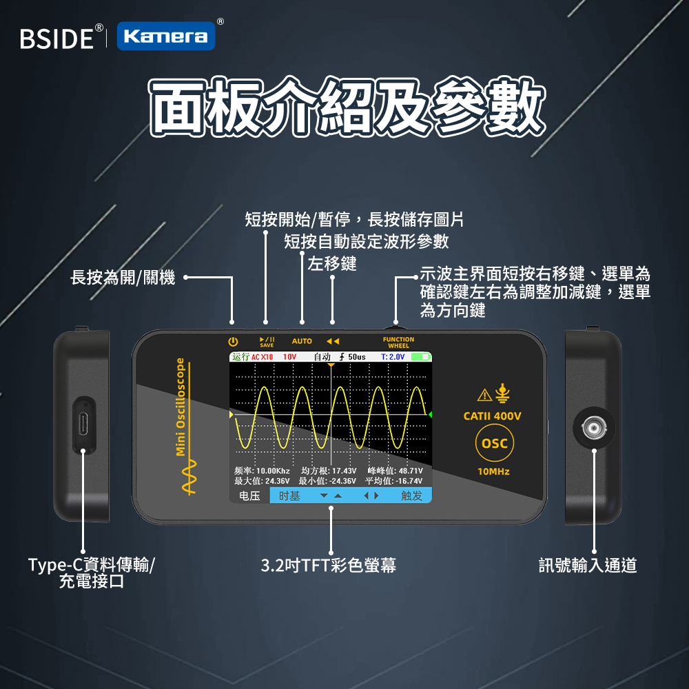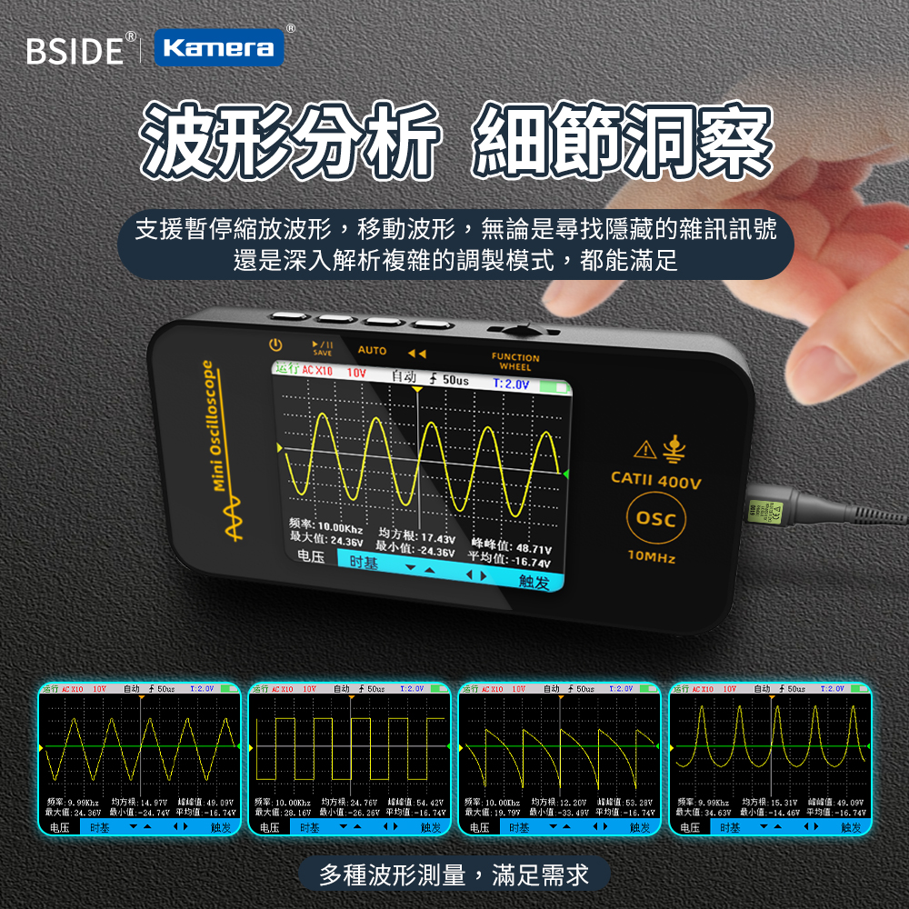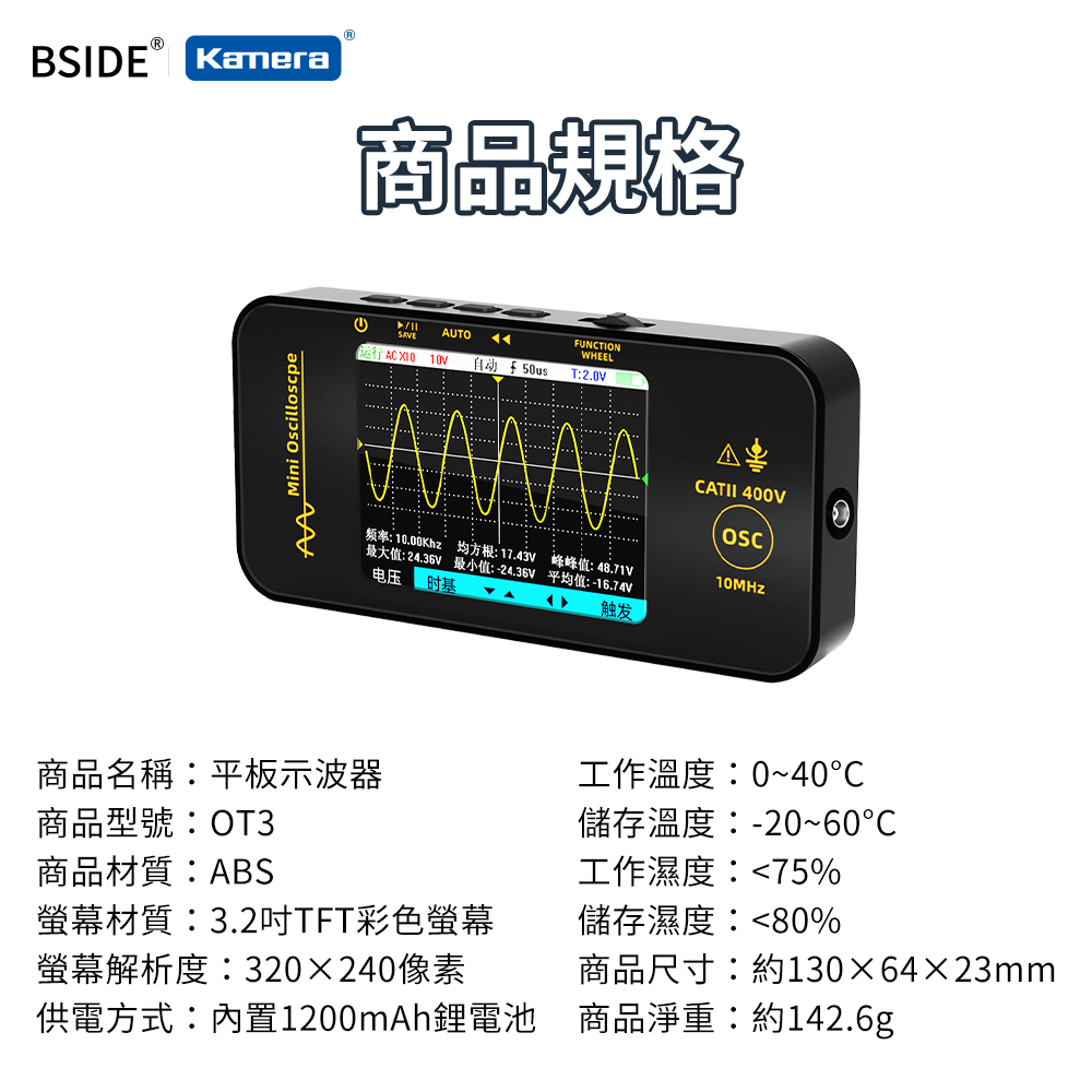 產品特點● 輕巧便攜,隨時出任務:機身小巧輕盈,輕鬆收納於工具箱或背包中,外出維修、現場測試都不受限,讓你隨時帶著走、隨地即測試。● 內建1200mAh電池,行動測試更自在:無須外接電源即可長時間使用,提升現場作業的靈活度與便利性,特別適合無電源環境或戶外維修需求。● 智慧防燒設計,新手也能安心上手:具備過載與保護機制,可有效避免誤操作導致設備損壞,大幅延長使用壽命,是專業與入門使用者的可靠助手。● 3.2吋TFT彩色螢幕,訊號清晰易讀:採用高對比彩色顯示螢幕,波形、數據一目了然,操作介面直覺友善,大幅提升測試效率與準確度。