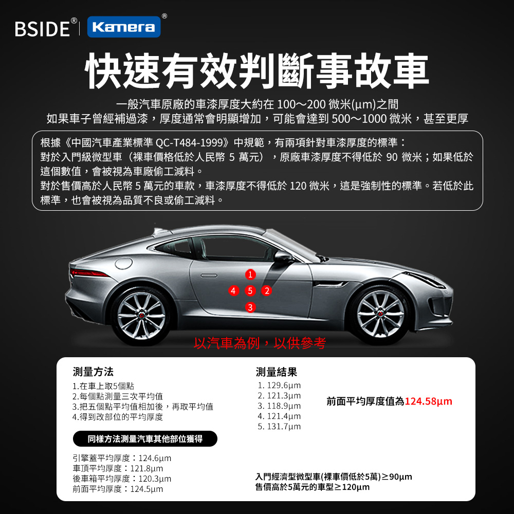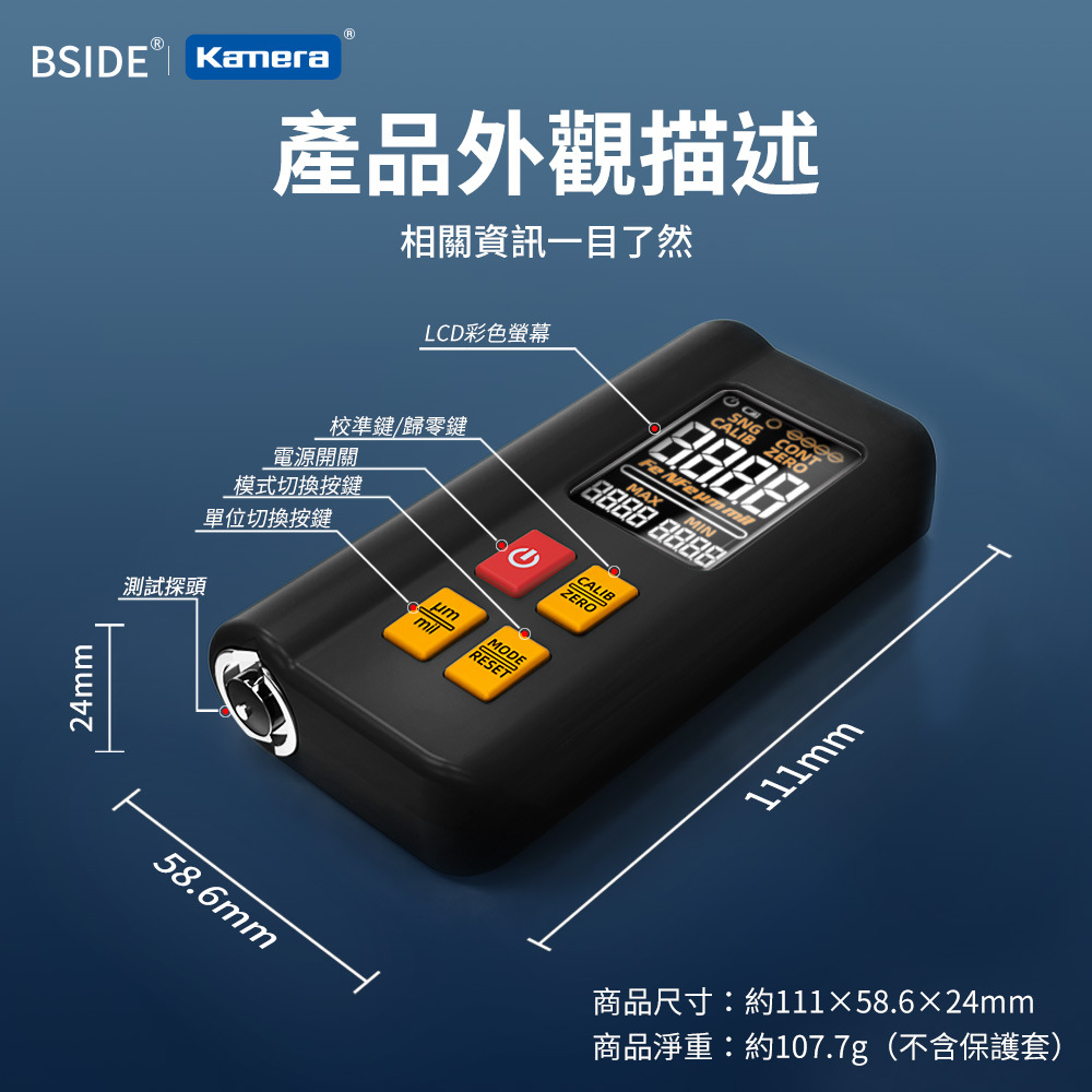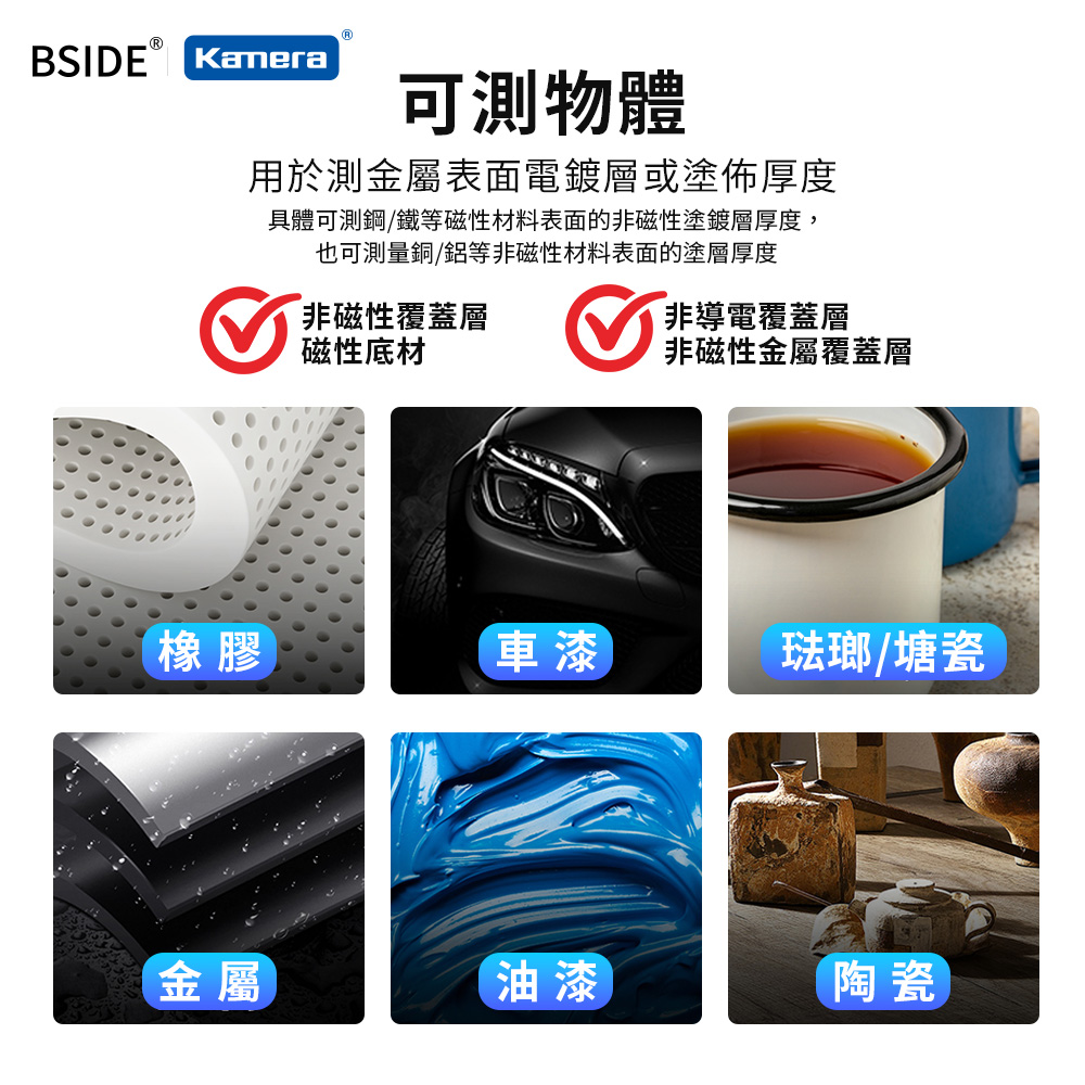 產品特點● 可自動辨識磁性(如鐵)與非磁性(如鋁)金屬基材,對應不同塗層類型,像是汽車烤漆、金屬防鏽層等都能輕鬆測量。● 採用內建 3.7V 鋰電池設計,省去更換電池的麻煩,一次充電可長時間使用,提升便利性。● 配備 1.94 吋 LCD 螢幕,讀值清楚易辨,避免因判讀錯誤而導致檢測失準。● 隨附多片透明校準片及鐵/鋁基材,方便用戶進行日常校正,確保每次測量的準確性與穩定性。● 機身輕量、外型簡約,ABS 材質兼具輕盈與耐用,無論是現場檢修或隨身攜帶都方便。● 操作直覺,初學者也能快速上手。免繁瑣設定,開機即可使用,讓汽車美容、二手車買賣等場景快速進行塗層檢查。