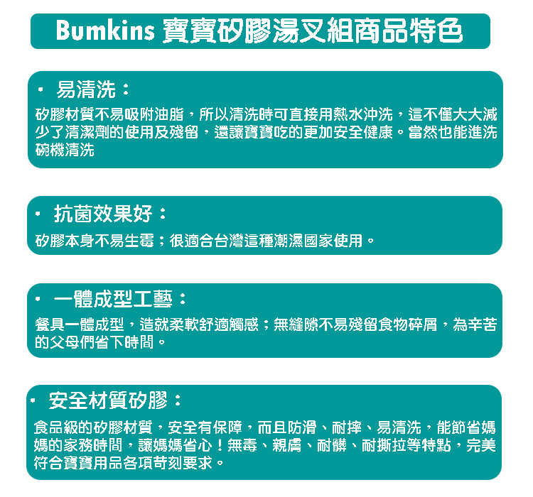 什麼是『有機矽膠材質』?是這幾年廣泛用於兒童餐具材質,具有安全性,耐用性和柔韌性。有機矽是由氧氣和鍵合矽(一種在沙子和岩石中發現的非常常見的天然元素)製成的Bumkins僅在我們的產品中使用100%食品安全的有機矽,而沒有任何填充劑我們的產品始終經過第三方實驗室的測試,並達到或超過CPSIA和FDA建立的所有美國安全標準 Bumkins使用最高質量的固化工藝-鉑固化 鉑金固化過程不會產生任何副產物,從而確保您獲得最純的有機矽白金固化劑與過氧化物劑的優點--• 耐用性提高• 更好的抗污漬,氣味和細菌的能力• 更高的抗粘著性,因此食物容易洗掉• 灰塵和污垢粘附的可能性較小• 主要用於有機矽醫療器械100%食品級矽膠材質把柄雙橢圓設計,防止寶貝誤吞噎到平放不會碰觸桌面,圓形握把設計方便抓握矽膠柔軟特性,餐具掉落地面無聲不會嚇到寶貝易清洗矽膠不易吸附油脂,清洗可以用熱水沖洗,大大減少清潔劑殘留,讓寶寶吃的安全健康,也能進洗碗機清洗抗菌效果好矽膠不易生霉,適合台灣潮濕氣候貼心設計平放不會接觸桌面,避免桌子髒污依附餐具,圓形握把貼心設計,讓寶寶輕易上手分享食物,把柄雙橢圓設計,防止寶貝誤吞噎到一體成型工藝餐具一體成型,造就柔軟舒適觸感,無縫隙不易殘留食物碎屑,為忙碌父母省下時間安全矽膠材質食品及矽膠材質,安全有保障,防滑耐摔易清洗,節省媽媽家務時間,無毒親膚耐髒耐撕拉,完美符合寶寶用品的各項苛刻標準