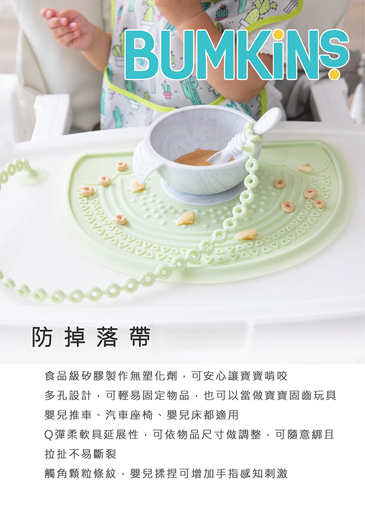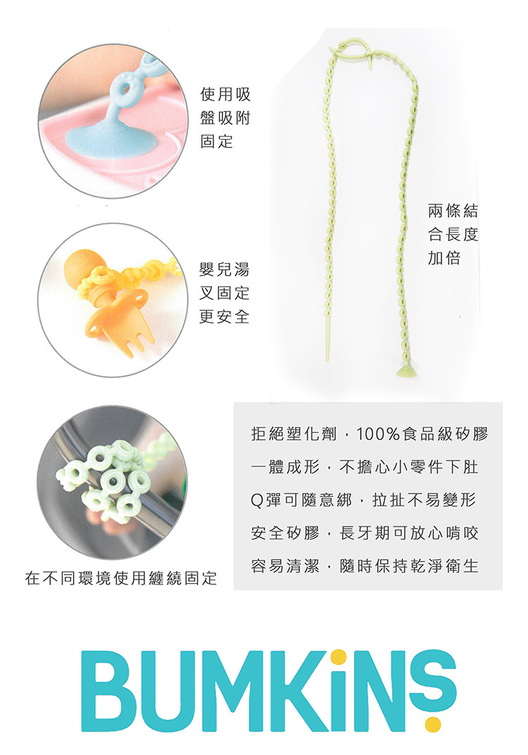 食品級矽膠製作無塑化劑,可安心讓寶寶啃咬多孔設計,可輕易固定物品,也可以當做寶寶固齒玩具嬰兒推車、汽車座椅、嬰兒床都適用Q彈柔軟具延展性,可依物品尺寸做調整,可隨意綁且拉扯不易斷裂觸角顆粒條紋,嬰兒揉捏可增加手指感知刺激