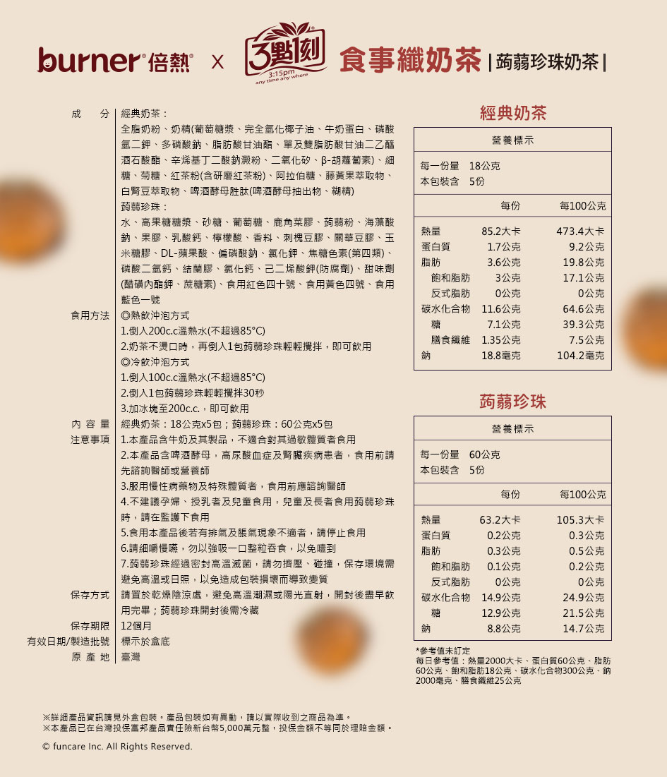 經典奶茶: 全脂奶粉、奶精(葡萄糖漿、完全氫化椰子油、牛奶蛋白、磷酸氫二鉀、多磷酸鈉、脂肪酸甘油酯、單及雙脂肪酸甘油二乙醯酒石酸酯、辛烯基丁二酸鈉澱粉、二氧化矽、β-胡蘿蔔素)、細糖、菊糖、紅茶粉(含研磨紅茶粉)、阿拉伯糖、藤黃果萃取物、白腎豆萃取物、啤酒酵母胜肽(啤酒酵母抽出物、糊精) 蒟蒻珍珠: 水、高果糖糖漿、砂糖、葡萄糖、鹿角菜膠、蒟蒻粉、海藻酸鈉、果膠、乳酸鈣、檸檬酸、香料、刺槐豆膠、關華豆膠、玉米糖膠、DL-蘋果酸、偏磷酸鈉、氯化鉀、焦糖色素(第四類)、磷酸二氫鈣、結蘭膠、氯化鈣、己二烯酸鉀(防腐劑)、甜味劑(醋磺內酯鉀、蔗糖素)、食用紅色四十號、食用黃色四號、食用藍色一號