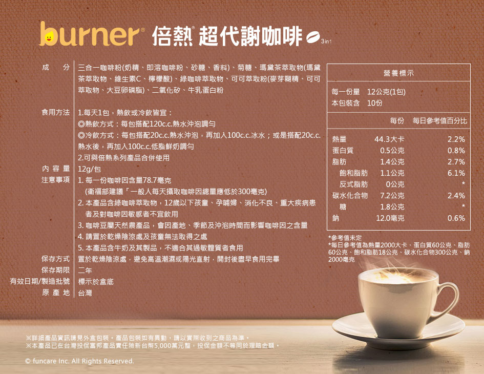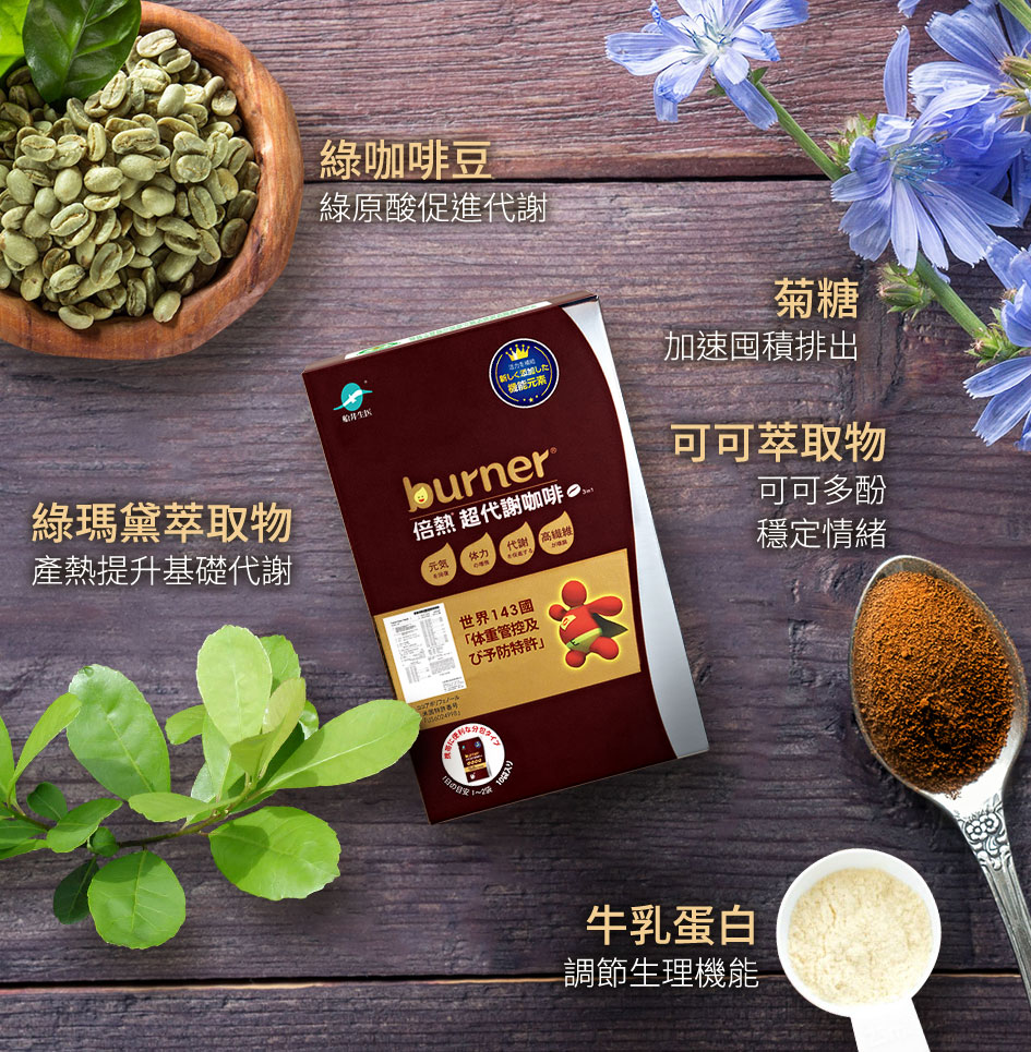 三合一咖啡粉(奶精、即溶咖啡粉、砂糖、香料)、菊糖、瑪黛茶萃取物(瑪黛茶萃取物、維生素C、檸檬酸)、綠咖啡萃取物、可可萃取粉(麥芽糊精、可可萃取物、大豆卵磷脂)、二氧化矽、牛乳蛋白粉