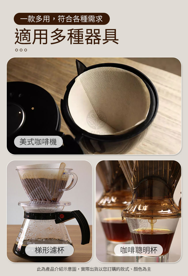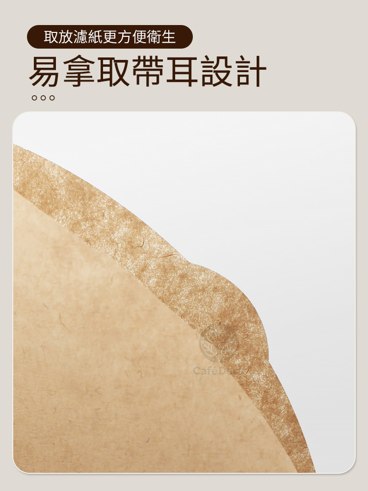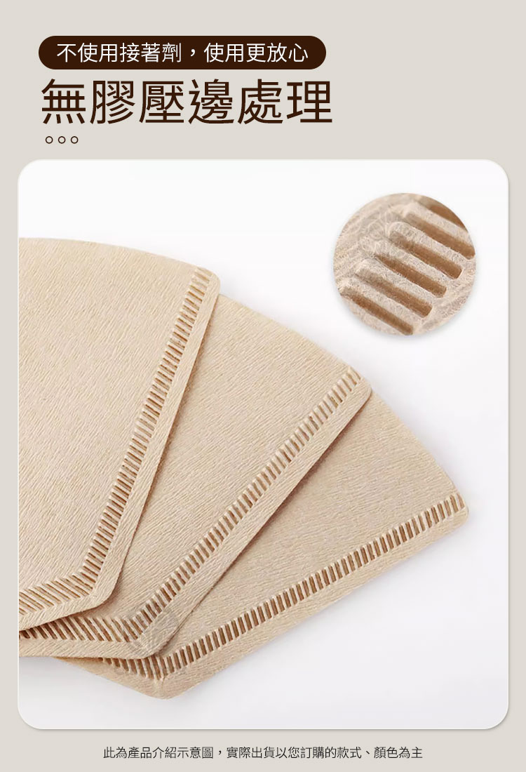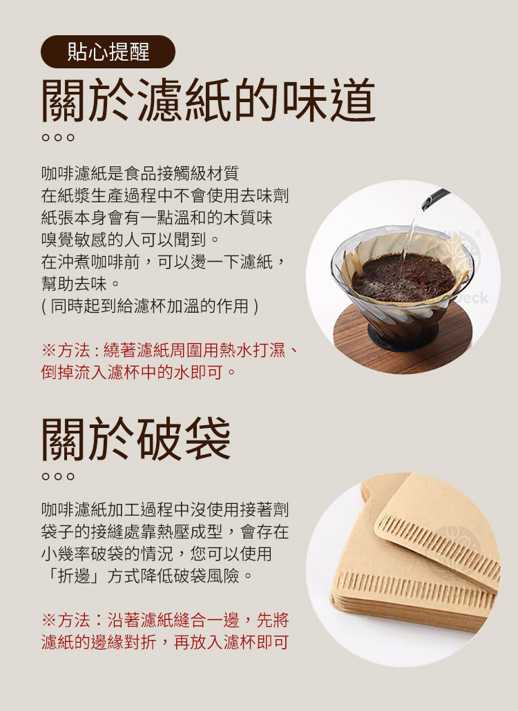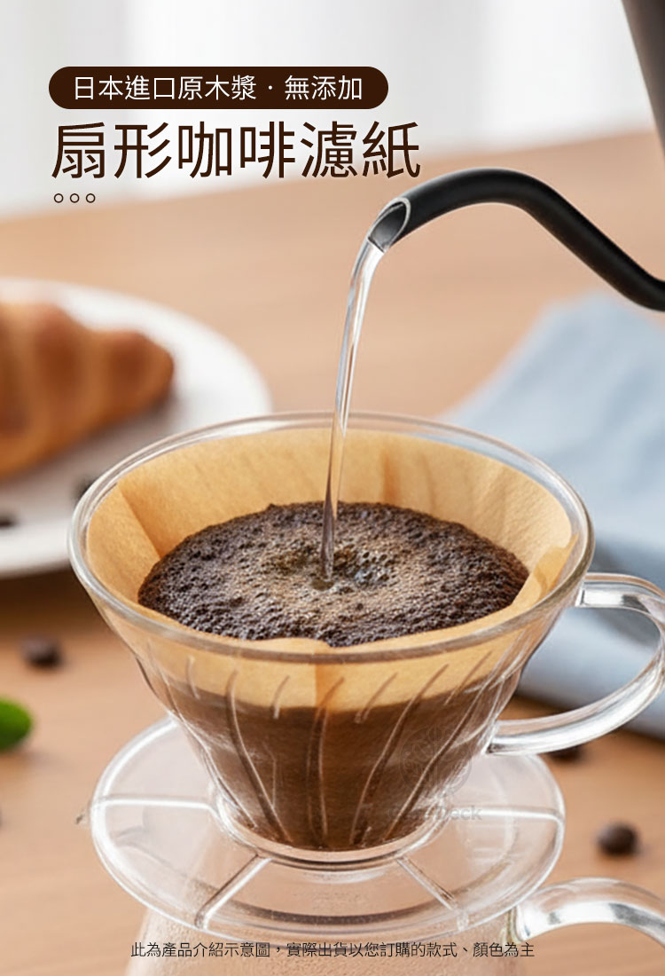 CaféDeck 日本原木漿 V60扇形咖啡過濾紙|每一滴香氣,從濾紙開始精選日本原木漿V60扇形咖啡過濾紙,為重視手沖儀式與咖啡純淨度的您而生。我們相信,一杯完美的咖啡,不僅來自豆子的選擇,更取決於每一道細節──包括那張看似平凡的濾紙。☕ 日本原木漿製・天然無漂白選用日本原生木漿纖維,不含螢光劑與漂白劑,紙質密度高、透氣性佳,萃取均勻更穩定。🌿 無膠壓邊技術・沖煮更安心採熱壓封邊,不使用任何接著劑,沖煮時無化學氣味釋放,維持咖啡純淨風味。🌀 扇形設計・完美貼合濾杯V60專用扇形結構設計,能緊密貼合濾杯壁面,讓熱水流速與萃取更均勻。💧 多款濾杯適用・靈活便利兼容V60濾杯、美式咖啡機、梯形濾杯、聰明濾杯等,無論家用或辦公皆輕鬆使用。👉使用方式與沖煮建議:1.沿濾紙底部右側摺邊。2.展開後放入濾杯,使其貼合杯壁。3.以熱水潤濕濾紙,去除木質味並預熱濾杯。4.放入研磨咖啡粉後,從中心緩慢注水沖煮。5.約45秒內完成均勻萃取,一杯香氣馥郁的咖啡即可享用。👉使用後你會發現~香氣更純、層次更明亮咖啡液更乾淨透明,沒有殘渣與紙味干擾。熱水緩緩注入時,濾紙穩定支撐咖啡粉層,使香氣充分綻放,酸甜平衡更明顯。不論晨間第一杯、午後悠閒時光或待客時刻,每一口都能感受到「純萃原香」。👉再好的咖啡豆,也敵不過劣質濾紙的干擾。選擇 CaféDeck 日本原木漿V60扇形濾紙,讓每一滴香氣都物盡其美。一次備好多包,無論日常沖煮或送禮皆宜。#CaféDeck手沖日常 #無漂白濾紙 #精品咖啡必備 #V60濾紙 #原木漿濾紙📣 FAQ (常見問答)Q1:這款濾紙有漂白或膠味嗎?A1:完全沒有。採用日本原木漿無漂白製程與無膠壓邊技術,保留自然木色與純淨香氣。Q2:可以搭配哪些濾杯使用?A2:適用於V60濾杯、梯形濾杯、美式咖啡機、聰明濾杯等多種手沖器具。Q3:第一次使用要先沖洗嗎?A3:建議先以熱水潤濕濾紙,可去除紙味並預熱濾杯。Q4:會容易破嗎?A4:不易破,但建議沿縫線折邊後放入濾杯,可降低破袋機率。Q5:保存方式是什麼?A5:請放置於乾燥陰涼處,避免潮濕與陽光直射,保持紙質潔淨與香氣穩定。注意事項:1.初次使用前建議以熱水潤濕去除自然木質味。2.使用後請勿重複使用,以確保風味純淨。3.避免存放於高溫潮濕環境,以免受潮變形。4.非可溶於水材質,請勿丟入馬桶。5.為食品接觸級商品,拆封後請盡快使用完畢。