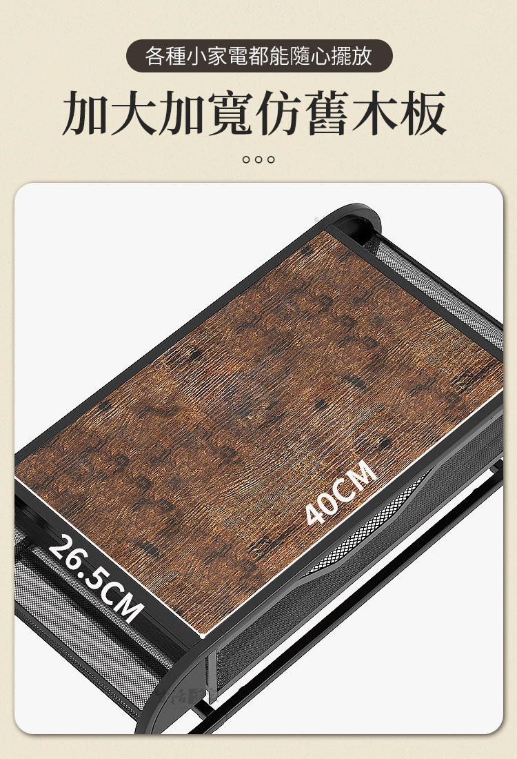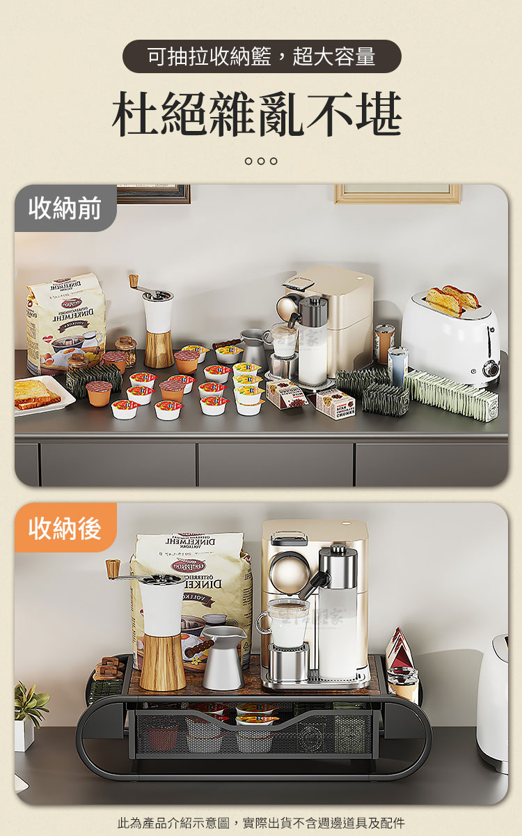 CaféDeck 咖啡茶包抽屜置物架 鐵木質感款|大容量整齊收納+穩固承重+免組裝設計想要讓咖啡角落更整潔、更有質感嗎?☕CaféDeck 鐵木款抽屜置物架,結合鐵藝框架與木紋檯面,不僅能承重咖啡機、烤麵包機,更能輕鬆收納咖啡膠囊、茶包、糖包,讓您的居家或辦公空間瞬間變得乾淨俐落。👉 抽屜式設計|分類整齊不凌亂大容量抽屜可放置咖啡膠囊、茶包、小零食,推拉順暢,收納一目了然。👉 鐵木結合|穩固承重不晃動碳鋼材質+仿舊木紋檯面,可承重高達 30kg,小家電擺放穩固安全。👉 多場景應用|廚房、辦公、咖啡角落皆宜不僅能作為咖啡茶具收納架,也可擺放印表機、文具、音響等,靈活多用。👉 質感設計|簡約百搭美學鐵木搭配黑色曲線框架,提升空間氛圍,打造質感生活角落。🌈 使用後你會發現~✔ 桌面不再雜亂,咖啡角落秒變質感小天地✔ 泡咖啡、泡茶時,茶包糖包伸手即取,更高效率✔ 提升空間利用率,廚房、辦公室都能享受整齊清爽✔ 兼具 收納+承重+美感,一架多用,物超所值如果您正在煩惱咖啡茶具總是散落在桌面上,或者小家電沒有合適的收納空間,那麼 CaféDeck 鐵木款抽屜收納架 正是您需要的答案!✨立即入手,讓您的生活空間更整潔、更有質感。#咖啡角落收納 #茶包抽屜置物架 #鐵木收納架 #桌面整理神器 #CaféDeck📣 FAQ (常見問答)Q1:請問收納架可以承重多少?A1:此款可承重高達 30kg,咖啡機、烤麵包機等小家電都能穩固擺放。Q2:抽屜可以放多少咖啡膠囊或茶包?A2:抽屜為大容量設計,可放置 50~70 個膠囊或茶包,分類整齊好取用。Q3:需要自行組裝嗎?A3:是的,需要自行組裝,內附說明書及零件,組裝不困難哦。Q4:除了咖啡茶具,還能收納什麼?A4:可用於收納文具、零食、印表機列印紙、餐具等,多用途應用。Q5:材質會不會容易生鏽?A5:採用碳鋼烤漆工藝,耐用防潮,正常使用環境下不易生鏽。注意事項:1.請避免長時間放置於潮濕環境,以延長使用壽命。2.承重雖達 30kg,但建議均勻受力,避免單點過重。3.請勿使用尖銳物品刮磨表面,以免影響美觀與防護層。4.商品示意圖僅供參考,出貨不含咖啡機、茶具等配件。5.建議定期清潔,以保持檯面與抽屜整潔衛生。6.商品內附組裝說明書,請組裝無誤後再使用。7.鐵木為天然木材,每片紋路會都會不同,無法指定紋路。