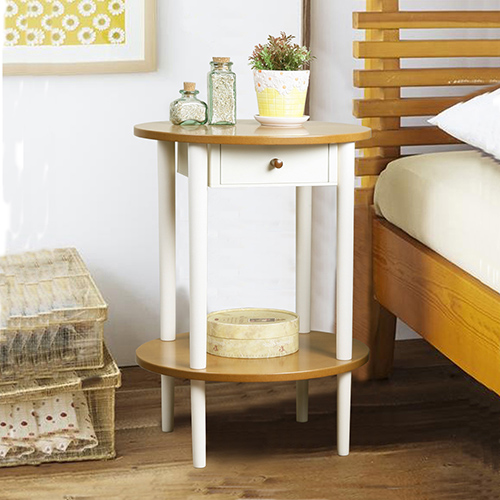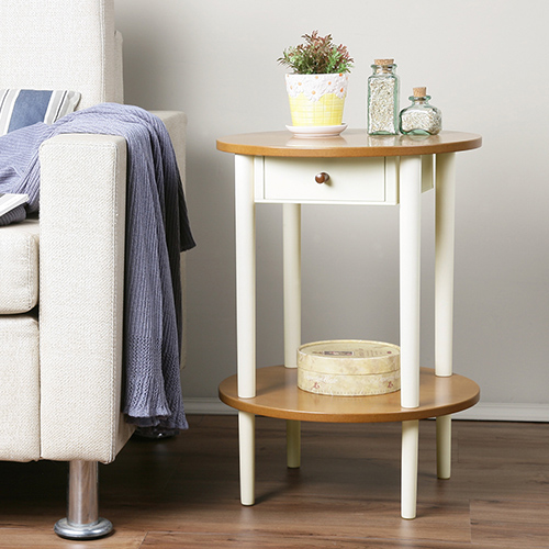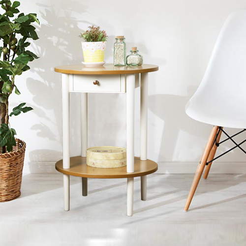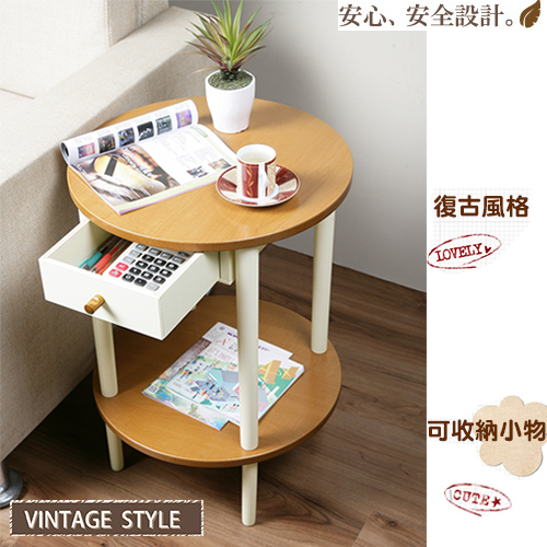 源於自然的品味生活,風靡歐美日韓的古木系列家具讓您回到最初的自然與散發獨特氣息的風格,反璞歸真的感動,沒有多餘的贅飾,回味鄉村情懷,值得您收藏! 古木或仿古木系列產品,主體支柱採用實木並搭配桌板與層板表面的清新木紋,講究追求鄉村風格的白色以及原木色系配色處理,洋溢自然鄉村風情! 《鄉村趣》古木調圓形茶几邊桌,沒有任何銳角沒有碰撞危險的圓形桌面,可愛小巧造型適合放置於沙發或者床邊當成側邊茶几桌使用,上面有一個收納的小抽屜,收納文具、筆記本、乳液等小物非常適合,下方則有一個圓形置物層板,只要在天板鋪起一片優雅小方巾,擺放盆栽來裝飾,您的居家質感立即提升,是喜愛鄉村風格的您最佳的選擇!