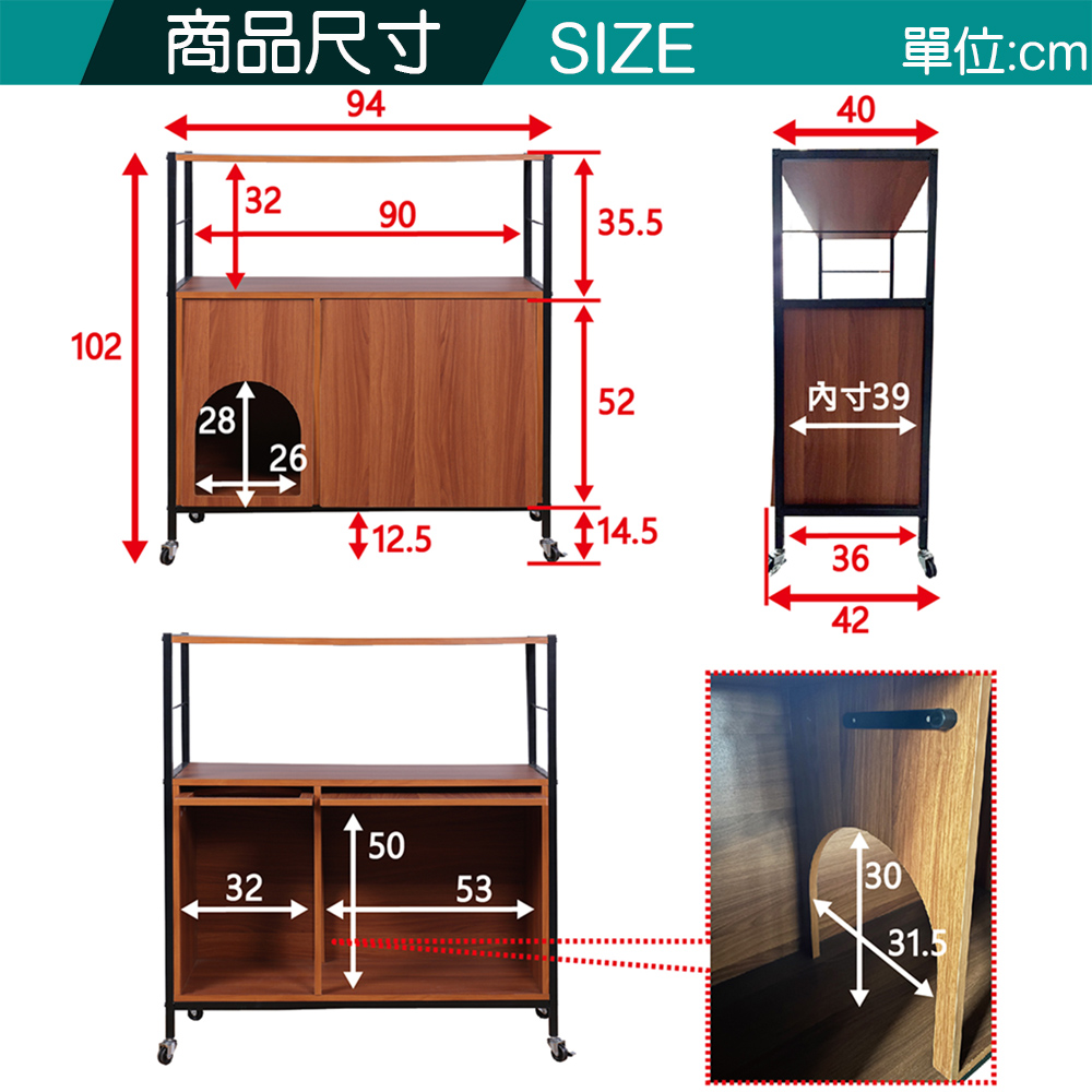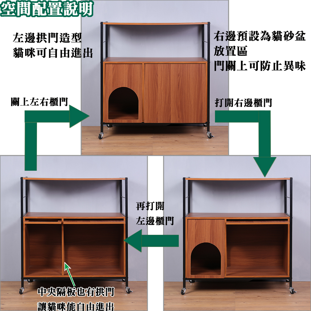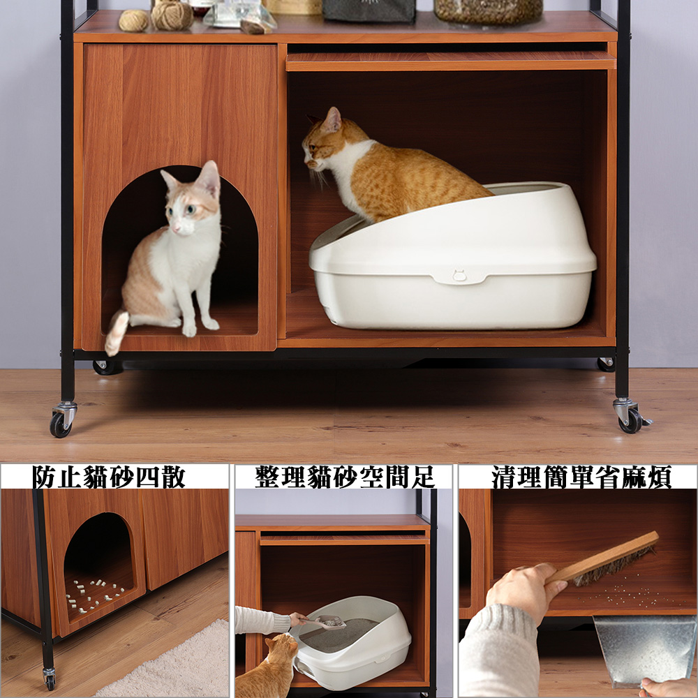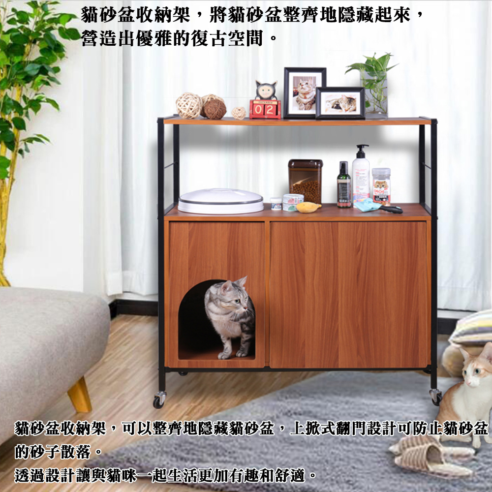 這是一款人貓共同生活所必需的收納櫃,巧妙的將飼主與愛貓的需求結合在這個收納櫃上,經過巧思與設計讓與貓咪共處一起生活變得更加友善、便捷、舒適、有趣,愛貓一族不可錯過。貓跟人一樣都要有私密空間如廁也都需要隱私的,本商品能將貓砂盆收納在收納櫃的門內,貓咪可以從拱門進入自己私密的空間,上掀式翻門的設計除了隱藏與遮蔽以及防止異味還能夠阻擋貓砂到處飛散與掉落,清理變得更簡單更輕鬆,居家環境不再被到處亂放的貓砂盆影響了觀瞻,提升環境的品質。日本最流行的復古『鐵』』+『木』組合商品,黑色烤漆鐵管與木紋明顯的木板,營造出工業復古風格,高質感有格調,100%台灣生產,放置物品、飾品或收納物品都很適合。