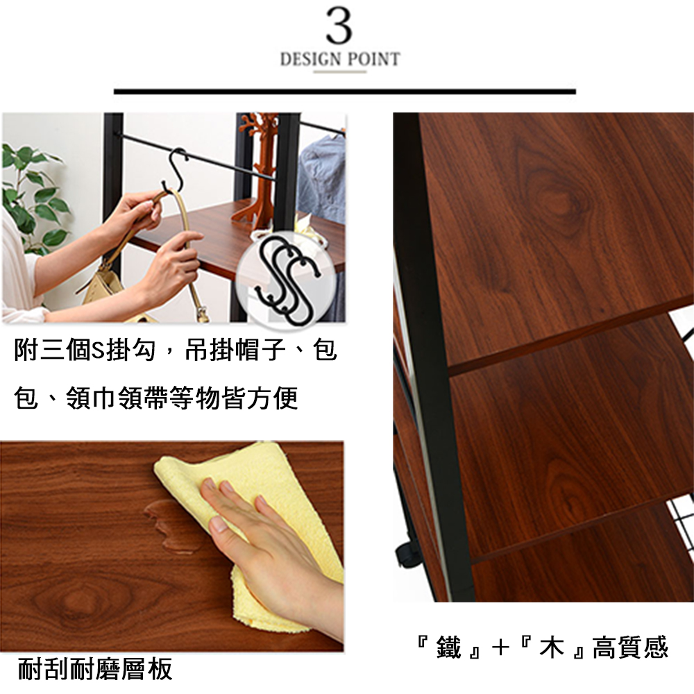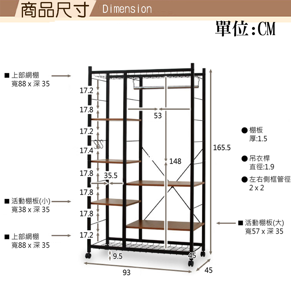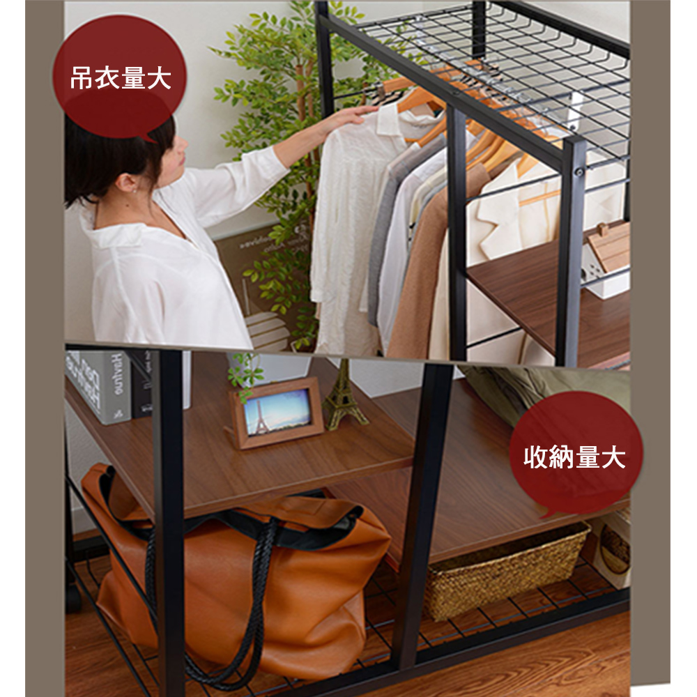 不景氣席捲全球,強調機能與外型的日本消費者,都開始回歸最基本的採購需求,設計新穎、簡單實用又兼具質感的商品目前在日本大行其道,《Justice》系列商品就是這波宅經濟的代表商品。《C&B》Justice移動式置物衣櫥架,是日本最新流行的復古『鐵』+『木』的組合商品,黑色烤漆的鐵管與木材紋路的木板,整體營造出工業復古風格,高質感有格調,100%台灣生產,採用符合日本市場要求的板材,表面使用防刮耐潑水的加硬波麗美耐處理,鐵管則是高質感的粉體塗裝烤漆,無論是層板的用料或鐵管的厚度與規格皆是外銷商品的要求,質感佳耐用性強。可依自己本身需要調整是本商品的設計重點,寬度93公分恰恰好,吊衣桿與層板都能夠隨使用者的需求在不需要卸下任何一個螺絲的情況下輕易地調整使用高度,創造多種使用模式,並能加購多組或同系列不同寬度的商品連接使用,完全符合您的使用需要。收納力:1. 置物網棚x上下各一2. 吊衣桿x13. 大層板x2 + 小層板x34. S掛勾x3機能性:1. 吊衣桿和層板皆可調整使用位置2. 附輪子可自在移動,四個活動輪當中更有兩個具煞車功能設計性:1. 工業風格兩種異素材的搭配,造型優雅2. 流行的外表,放置於房內使用提升質感■商品規格 尺寸 : 約(W)93*(D)45*(H)165.5CM 耐重 : 網棚:(約)5kg/個 層板:(約)5kg/個 吊衣桿:(約)20kg/支 主要材質 : 鐵管(粉體塗裝)、高密度塑合板(表面美耐處理) 產地 : 台灣 ■注意事項 1.本商品附詳細組裝說明書,需DIY自行組裝。 2.DIY商品經組裝後恕不接受退貨,請先確認商品是否符合要求。 3.商品圖檔顏色因電腦螢幕設定差異會略有不同,請以收到的實際商品顏色為準。 4.若需退貨,請保持商品及包裝之完整性,無法回復原出貨之完整包裝恕不接受退換貨。 5.送達地點有否限制:限本島,外島須外加運費。我們將事先與消費者聯繫報價,議定外島運費後,訂單始成立。 6.本島偏遠地區接單說明:物流業者定義之本島偏遠地區接單須另加聯運費。我們將事先與消費者聯繫報價,議定聯運費後,訂單始成立。 7.鑑賞期限制說明:溫馨提醒,鑑賞期非試用期, 敬請確認商品無瑕庛問題並確認購買後再使用。 8.收到貨品時,要將外箱保留至鑑賞期結束,不要讓貨運公司將外箱帶走,換貨時換貨商品必須是全新狀態(不得有刮傷),並有完整的包裝,包含外紙箱、配件紙箱、保麗龍、保護袋、贈品等所有附隨文件或資料之完整性。 9.偏遠地區概略表:以下地區為物流公司定義之偏遠地區概略(實際以貨運公司定義為準)。 (1).新竹:尖石鄉、五峰鄉 (2).苗栗:泰安鄉 (3).台中:梨山、谷關、環山、和平鄉 (4).南投:鹿谷鄉、信義鄉、仁愛鄉 (5).雲林:古坑鄉 (6).嘉義:阿里山鄉、梅山鄉、嘉義農場 (7).高雄:內門鄉、杉林鄉、甲仙鄉、六龜鄉、甲仙鄉(小林村)、六龜鄉(寶來村) (8).屏東:霧台鄉、春日鄉、泰武鄉、三地門鄉 (9).宜蘭:大同鄉、南澳鄉 (10).花蓮:秀林鄉、池上鄉、海端鄉 (11).台東:長濱鄉、東河鄉(北源村)、台東地區(牧場&監獄)