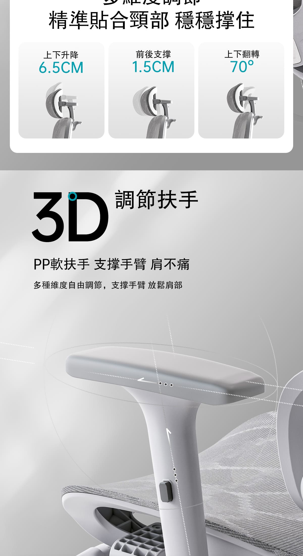 -3向調節頭枕+3向調節扶手適應多種使用