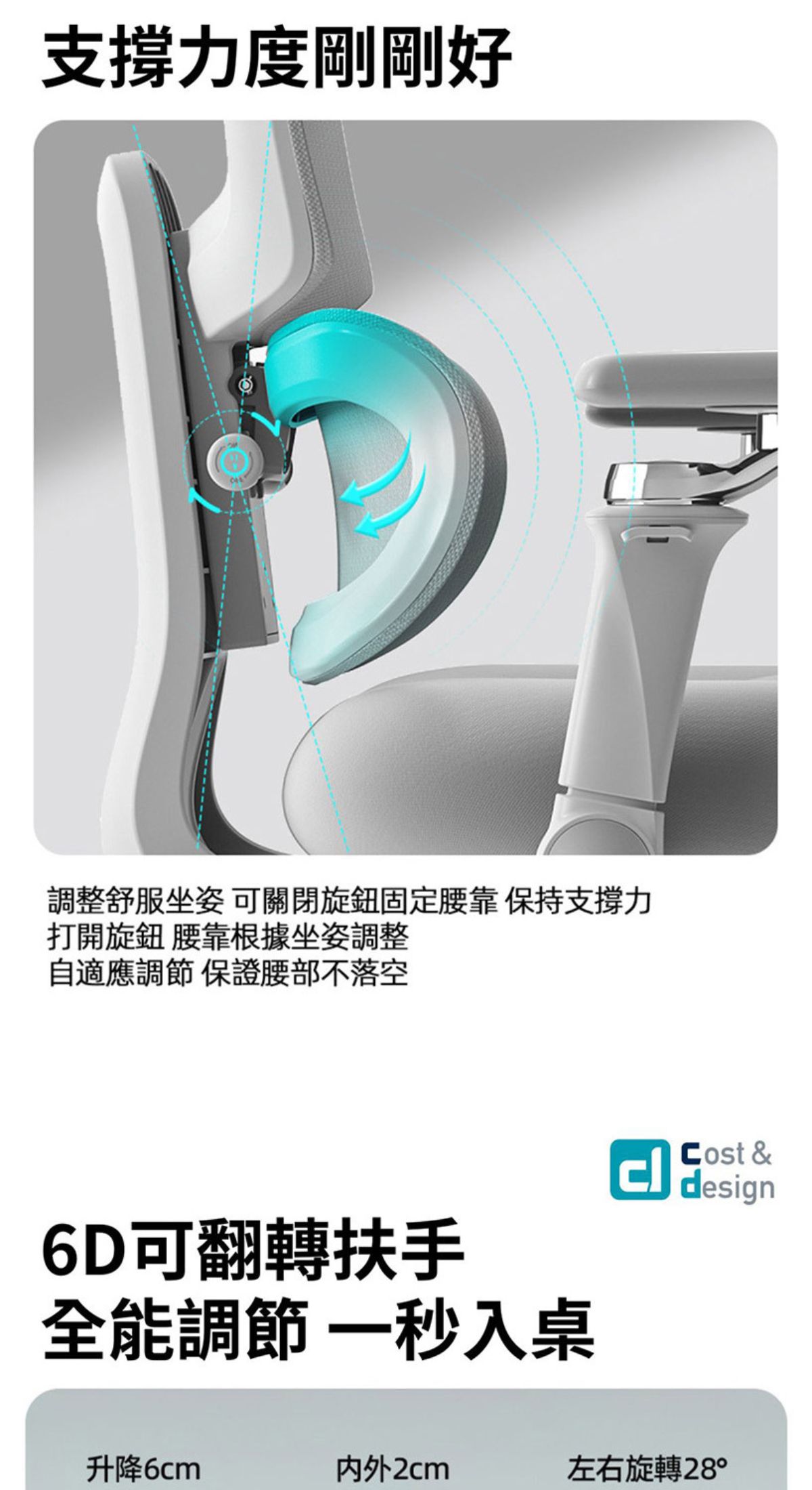 -3D調節頭枕+4D調節腰靠+6D可調扶手等部件,適應多種使用