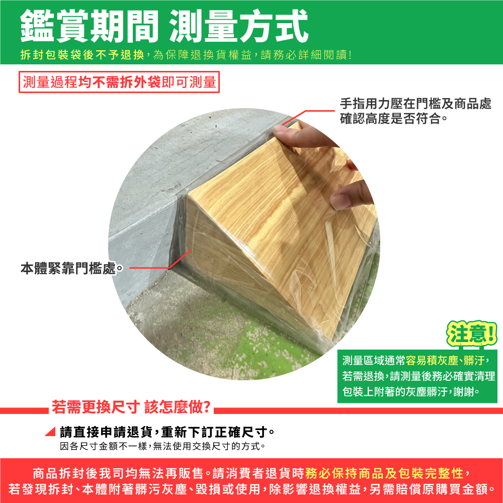 ★防範未然,守護安全的居家空間。★ 附有專用雙面膠。黏貼形式,安裝撕下都簡單 材質:EVA塑膠/壓克力系黏膠 1. 適用於房間、走道地板或各處大小門檻等場所,共有6種尺寸可搭配使用。 2. 柔軟材質,減緩碰撞衝擊,守護腳趾免於傷害。 3. 木紋色調,使用於走廊或木質地板,不影響整體美觀。 4. 長度可自由裁剪。 5. 附有專用雙面膠。黏貼形式,安裝撕下都簡單!! PS:請注意,尺寸表與產品實際尺寸會有+-10%範圍內誤差值的情形。 用途:緩衝高低差,預防絆倒危險發生。 使用方法: 1.將安裝處之灰塵、油分、水分擦拭乾淨。;2.剪裁適當長度,撕下剥離紙,貼上。3.張貼後請充分按壓。完成!! 注意事項: 1. 使用前請先於不明顯處試貼,確認沒有殘膠,表面不會剝落再行使用。(特別是合成板、壁紙) 2. 請勿使用於有水氣或浴室內等場所。 3. 請勿使用或放置於高溫、近火源、表面粗糙、凹凸處及高濕度的場所。 4. 使用溫度為-10度~50度範圍內。 5. 請注意,尺寸表與產品實際尺寸會有+-10%範圍內誤差值的情形。 6. 黏著面會因形狀、素材、使用狀況不同等情形,而無法適用。 7. 長時間可能產生劣化、伸縮、硬化、龜裂、褪色等情形發生,請定期更換。 8. 撕開時請勿過度強力撕扯。 9. 本產品主要是防止危險發生與降低傷害,保護者仍要善盡注意之責任。