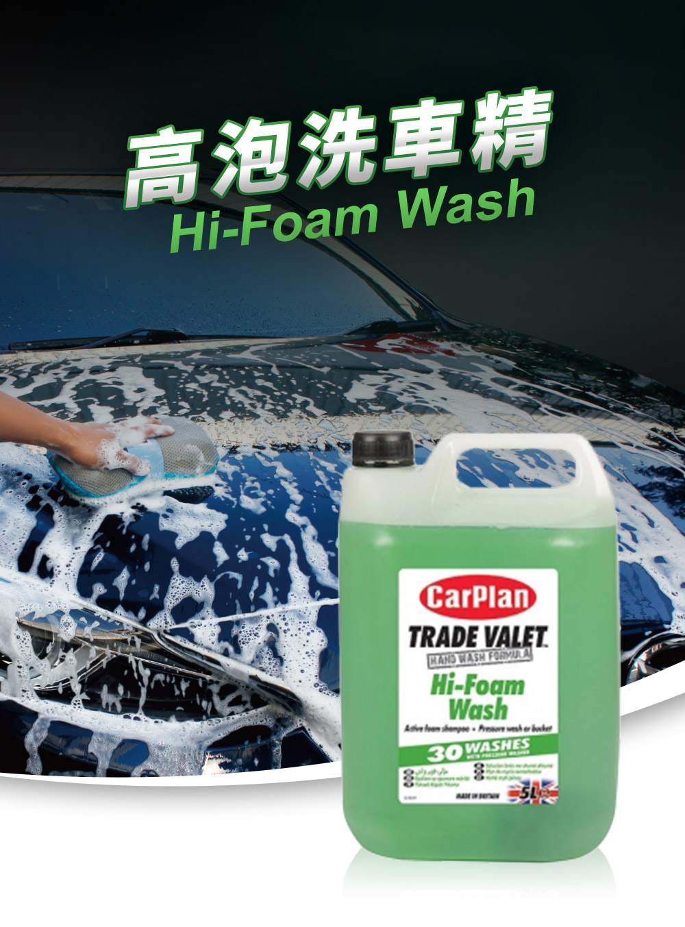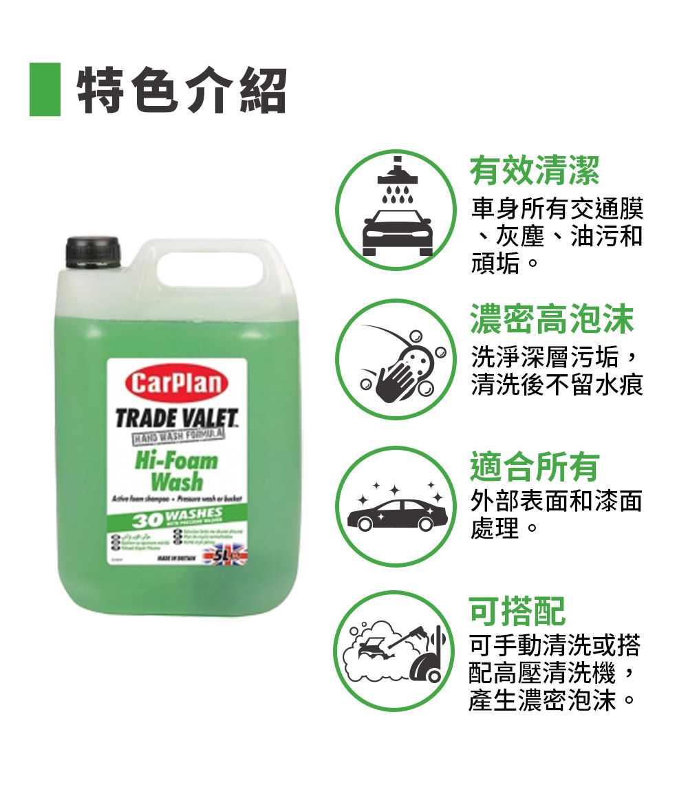 規格說明. 品牌:CarPlan卡派爾. 品名:TRADE VALET Hi-Foam Wash 高泡洗車精. 成分:Anionic surfactant、Non-ionic surfactants、Perfumes. 包裝:5公升/桶. 產地:英國