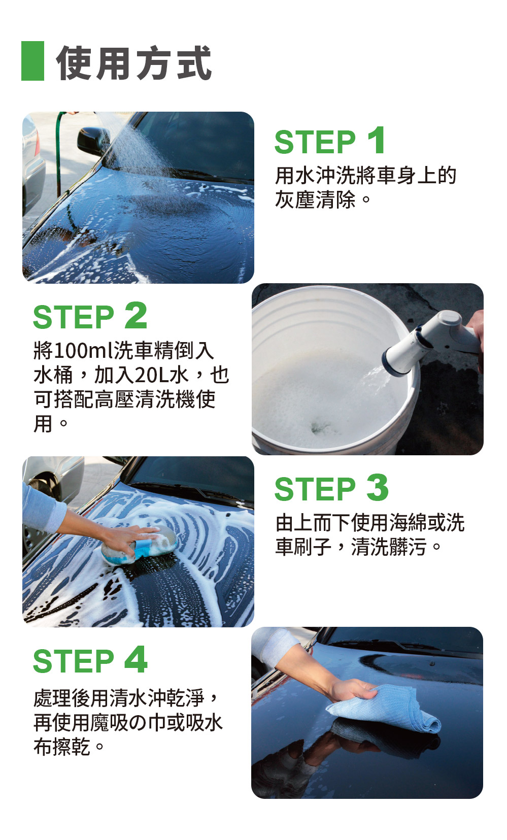 使用方法1.用水沖洗將車身上的灰塵清除。2.將100ml洗車精倒入水桶,加入20L水,也可搭配高壓清洗機使用。3.由上而下使用海綿或洗車刷子,清洗髒污。4.處理後用清水沖乾淨,再使用魔吸の巾或吸水布擦乾。