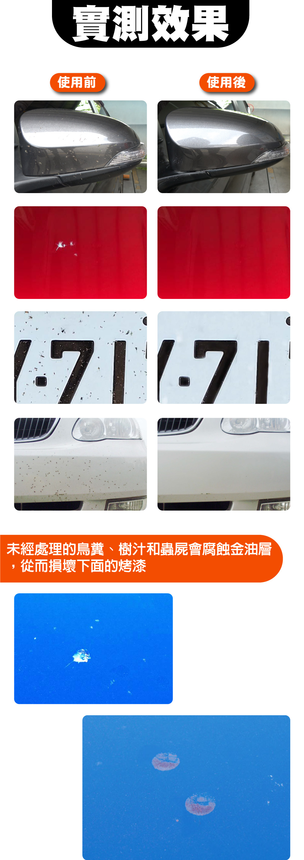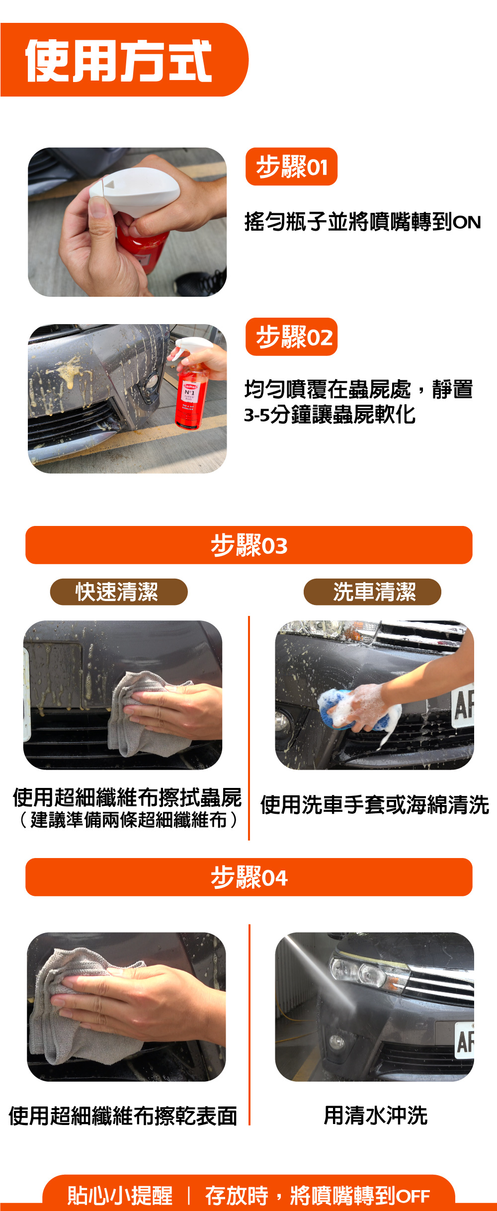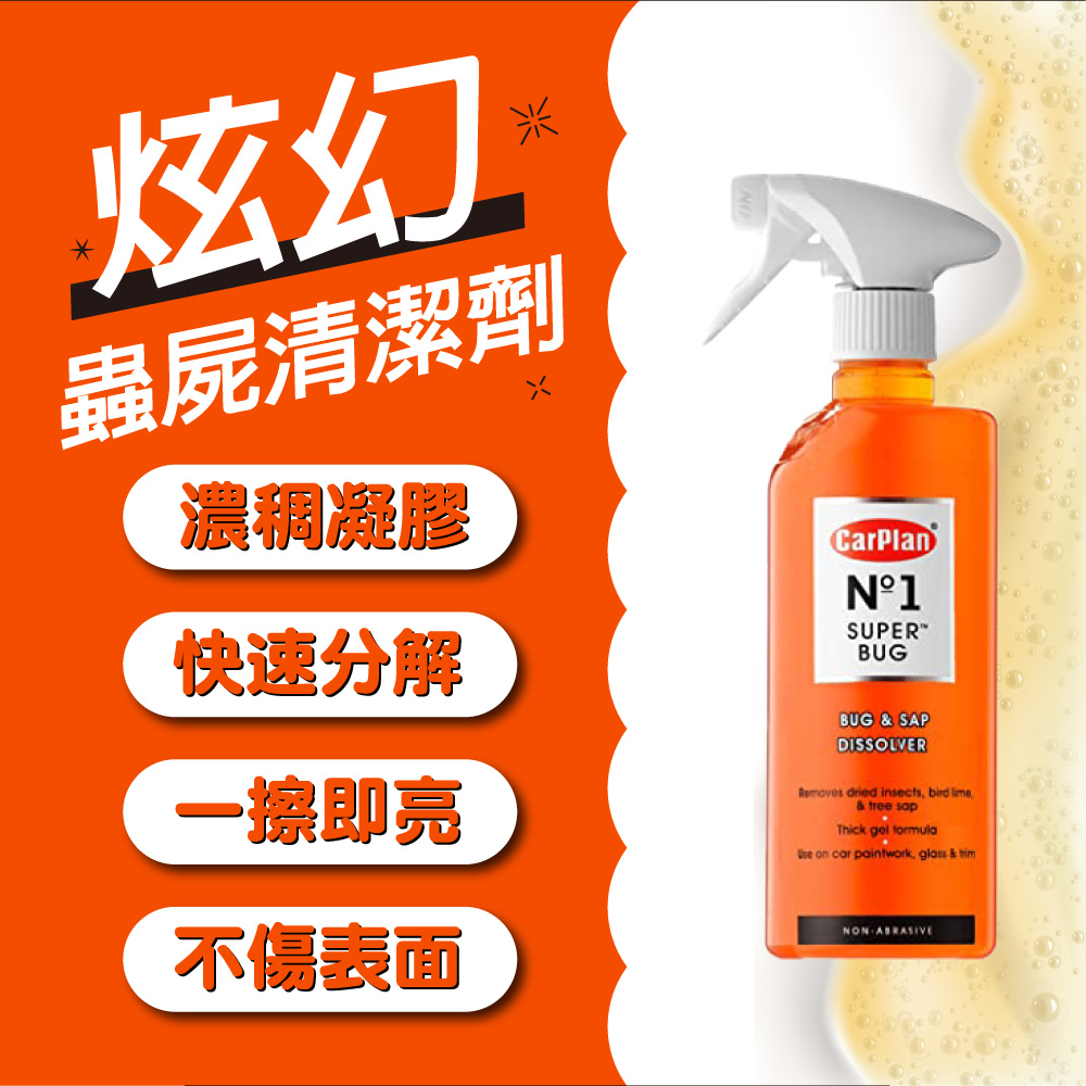 商品介紹‧快速分解蟲屍、鳥糞和樹汁。‧濃稠非研磨凝膠配方,不會損壞車漆表面。‧可安全用於烤漆、玻璃、鍍鉻、塑料、車燈和車牌。【快速清潔】使用方法1.搖勻瓶子並將噴嘴轉到ON。2.均勻噴覆在蟲屍處,靜置3-5分鐘讓蟲屍軟化。3.使用超細纖維布擦拭蟲屍(建議準備兩條超細纖維布)。4.使用超細纖維布擦淨表面。【洗車清潔】使用方法1.搖勻瓶子並將噴嘴轉到ON。2.均勻噴覆在蟲屍處,靜置3-5分鐘讓蟲屍軟化。3.使用洗車手套或海綿清洗。4.用清水沖洗。規格說明‧品牌:CarPlan卡派爾‧品名:Nº1 Super BUG 炫幻蟲屍清潔劑‧容量:600ml/罐‧製造商:英國Tetrosyl公司‧產地:英國注意事項‧請多準備幾塊乾淨的超細纖維布或軟布。‧對於頑垢使用更多的量,如果只是輕度髒污少量使用。‧如果布變得非常髒,最好是適時進行沖洗。‧大量泥砂的車輛最好是先使用洗車精來洗淨。‧使用時確保良好通風環境,盡量避免在陽光直射下使用。‧請避免讓孩童接觸,若不慎觸及眼睛請以大量清水沖洗並就醫檢查。