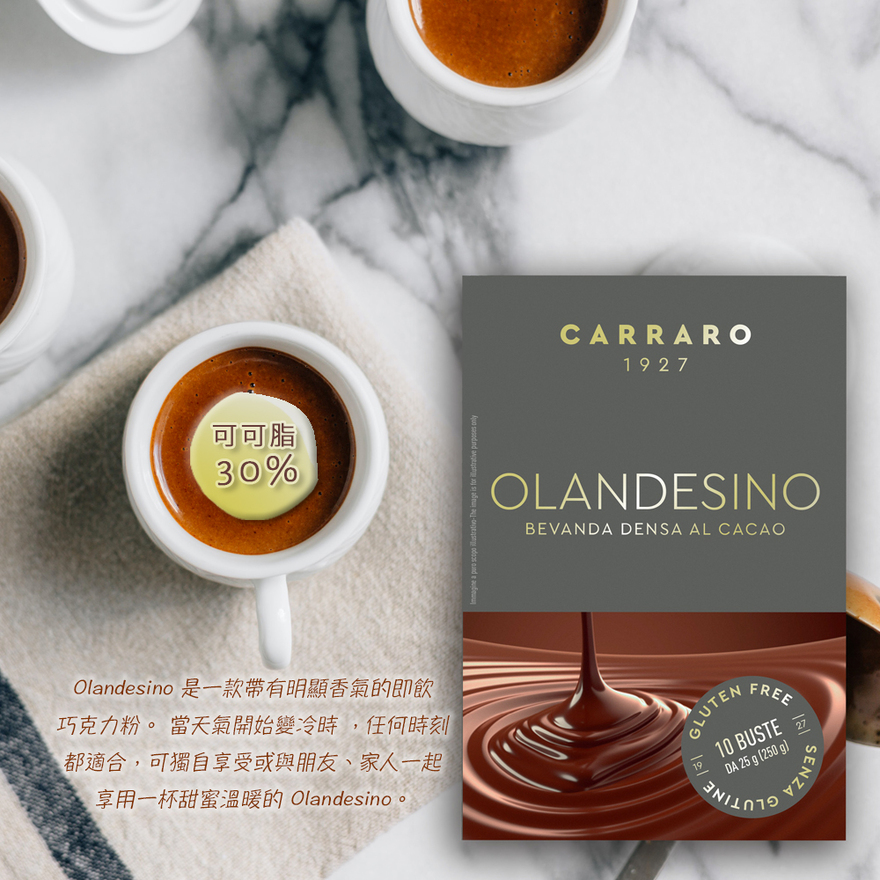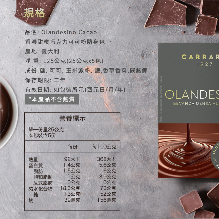【商品特色 】✔️ 義大利原裝進口。✔️ 攜帶方便✔️ 可可脂含量為 30% (含糖)。✔️ 隨時隨地立即沖泡。✔️ 濃郁的巧克力香氣。✔️ 加入牛奶沖泡,口感更濃郁。✔️ 請常溫存放、避免陽光直射。✔️ 本產品不含麩質。品味經典,品質卓越 — Carraro Olandesino堅持使用來自荷蘭最古老、最負盛名工坊的優質可可豆,經過嚴格挑選的可可豆,被直接送往義大利斯基奧小鎮,透過大師們精湛的製作工藝,精心製成香氣濃郁,口感綿滑柔順的Carraro Olandesino。每一口獨特的香氣都讓人陶醉,無論獨自品味或與親友分享, Olandesino香濃甜蜜巧克力可可粉都是極致選擇。✨ Olandesino 是一種帶有明顯香味的即飲巧克力粉。 當天氣開始變冷時,任何時刻都適合獨自、與朋友或與家人一起享用一杯可愛的 Olandesino。【 商品規格 】・品牌 :Carraro ・咖啡豆原產地 :義大利・有效期限 :標示於包裝上(西元 年/ 月/ 日)・保存期限 :2年・過敏原 :無・成分 :糖、可可、玉米澱粉、鹽、香草香料、碳酸鉀。*本產品不含麩質。・保存方法 :本產品請常溫保存在陰涼乾燥處,避免陽光直射或潮濕。・內容物 :可可脂含量為 30% (含糖)・淨重 :125g|(25g x 5包/ 盒)・進口商 :誠品生活股份有限公司・製造商 :Caffe Carraro S.p.A.・地址 :Via Lago di Pusiano, 20, 36015 Schio (VI) Italy