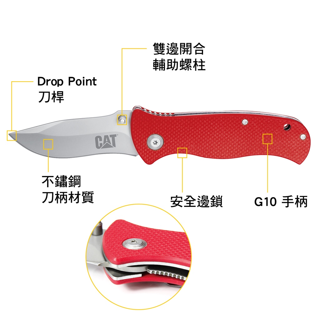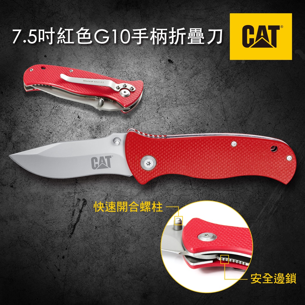 CAT折疊刀採用紅色G10材質加大手柄設計,不僅擁有與眾不同的極佳外觀,並且大幅提升使用時的舒適和便利性。 CAT折疊刀採用7Cr17mov 頂級合金鋼刀刃,材質兼具高硬度與超強韌性,使折疊刀極為鋒利而又耐用,可做為安全防身工具、登山露營折疊刀與戰術刀 。CAT工具紅色G10折疊刀具有刀片安全鎖定裝置,此為CAT工具獨家專利設計,在使用時,刀刃固定不摺疊回收。另外刀桿上的螺柱提供使用者單手快速展開折疊刀。 CAT紅色G10折疊刀展開總長達20公分,獨特的12公分大尺寸手柄配置,大大增加使用時的機動性,另一分面,透過輕量化設計,使折疊刀重量僅為5盎司,方便攜帶。