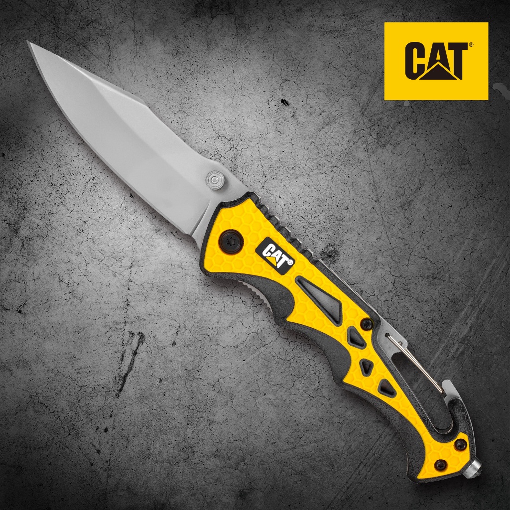 CAT八吋多功能折疊刀,採用黃色TPR止滑耐磨材質,不僅擁有與眾不同的極佳外觀,並且大幅提升使用時的舒適和便利性。 折疊刀為鋁合金材質手柄結合了耐用、輕便和時尚於一體,刀刃採用7CR17MOV合金鋼具有高硬度和超強韌性,材質兼具高硬度與超強韌性,使折疊刀極為鋒利而又耐用,可做為安全防身工具、登山露營折疊刀與戰術刀 。CAT八吋多功能折疊刀具有刀片安全鎖定裝置,此為CAT工具獨家專利設計,在使用時,刀刃固定不摺疊收回,大大的提高使用時的安全與便利性。另外刀桿上的螺柱提供使用者單手快速展開折疊刀。另一方面,在刀柄上加上經實驗室核可的窗戶擊破功能,可做為車上安全逃生工具使用。