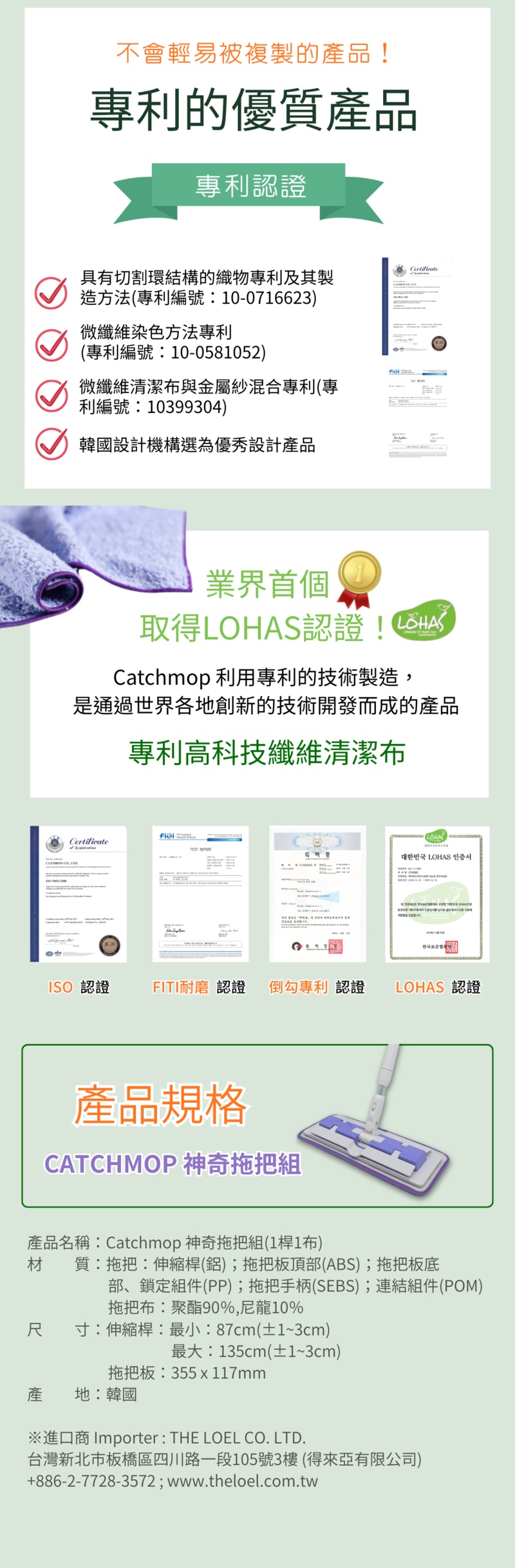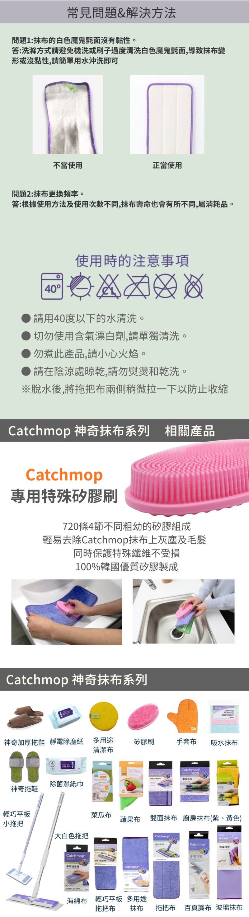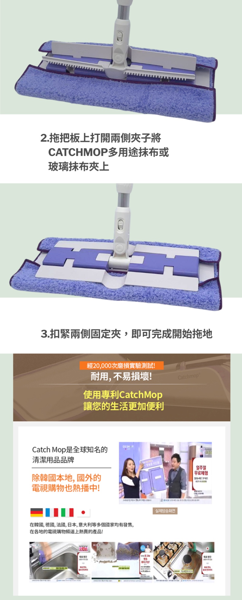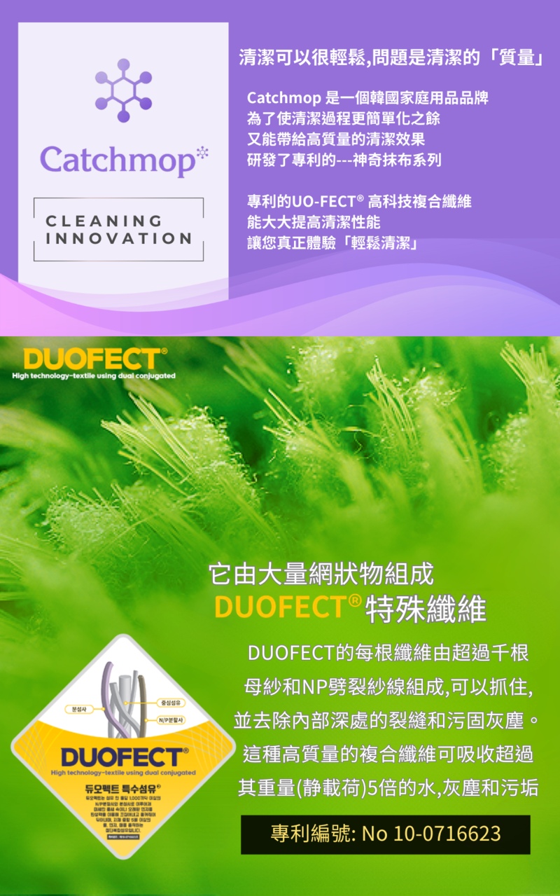 😍家居清潔神器, 韓國, 日本, 台灣, 美歐, 俄羅斯等地熱賣中😍韓國CatchMop倒勾專利神奇抹布 家居清潔必備!😍一試難忘, 心動不已👍能對頑垢、硬化的灰塵、水垢、焦油等發揮清潔功效,輕輕一擦就可以變乾淨,省時又省力;但若髒汙非常嚴重時,也可以搭配清潔劑一起使用,達到更好的清潔效果。- 專利倒勾抹布, 由高精度複合面料DUO-FECT®製成- 輕鬆抓住縫隙間的微小灰塵, 削屑- 容易清洗,用清水也能完全去除髒污- 可搭配少量清潔劑,加倍清潔, 對抗硬化的灰塵,水垢,焦油- 20,000次耐用測試,吸水力強,省錢,省時,省力又環保!!- 適用於木地板、膠地板、瓷磚等任何類型的地板產品詳情:產品:Catchmop 神奇拖把組(1桿1布)品牌:Catchmop材質:拖把:伸縮桿(鋁);拖把板頂部(ABS);拖把板底部、鎖定組件(PP);拖把手柄(SEBS);連結組件(POM)拖把布:聚酯90%,尼龍10%尺寸:伸縮桿:最小:87cm(±1~3cm);最大:135cm(±1~3cm);拖把板:355 x 117mm伸縮拖把桿重量: 0.6kg產地:韓國注意:1.請用低於40°C的水清洗。2.不要用含氯漂白劑清洗,並單獨清洗。3.不要煮拖把墊,遠離火源。4.請在陰涼處晾乾,不要熨燙乾洗。 (脫水後, 將拖把布兩側稍微拉一下以防止收縮)。5.拖把布: 可乾拖或濕拖. 建議清潔毛髮及粉塵等類時, 請使用乾拖. 因為在乾的狀態才是倒勾纖維發揮它功效的狀態。備註: 所有圖片及資料只供作參考,產品圖片及描述與實物或有區別,產品外觀及細節均以實物及代理商提供為準。資料如有更改,恕不另行通知
