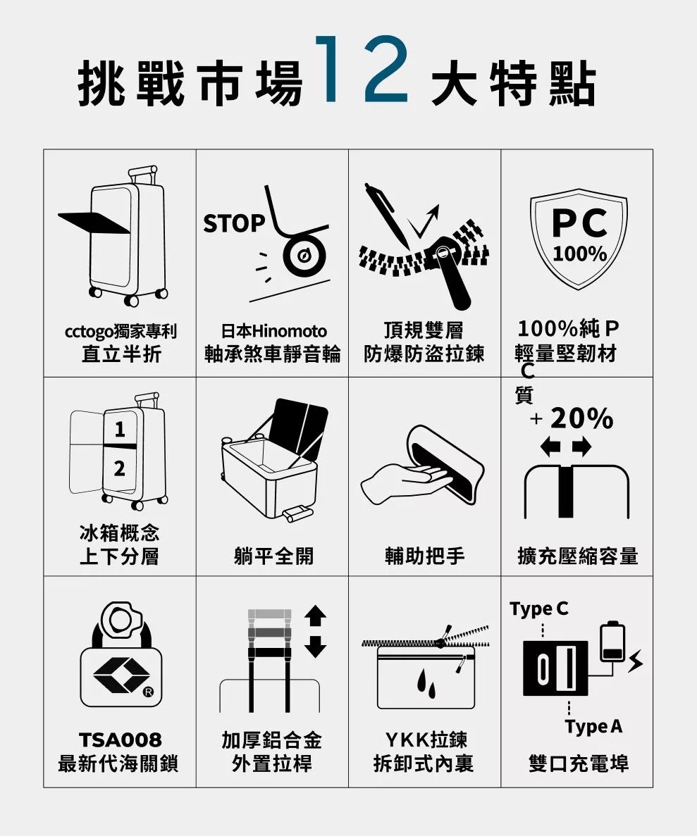 極致體驗 五大亮點◘ 極快取|半折前蓋專利,站立開箱不必躺開。◘ 極整齊|冰箱式收納分層,上下分層不凌亂。◘ 極省力|獨家軸承靜音萬向煞車輪,順滑超耐用。◘ 極輕量|德國100%PC塑鋼板,堅韌抗摔超輕盈。◘ 極安心| TSA008最新代海關鎖,安檢超快速。獨家設計 七大特色◘ 防爆拉鍊|雙齒防穿刺防栽贓,拉力達204kg。◘ 外置拉桿|多段式鋁合金,外置增加內部容量。◘ 擴縮容量|20%增量空間,裝的下想要得一切。◘ 拆洗內裡|病毒肆虐,拆洗內裡乾淨衛生無憂。◘ 乾濕分離|分離式防水袋,浴室物品一次打包。◘ 雙口充電|減輕身上重量,不帶電可安心托運。◘ 輔助把手|上提下握不滑手,搬運輕鬆不費力。獨家巧思 四大貼心◘ 超解放|日本置物櫃全適用,34吋也OK。◘ 超適放|電扶梯完美置放,不擔心滾下去。◘ 超貼心|同時推兩咖,兩箱輪子不打架。◘ 超平整|平整大箱頂,置物也能當桌子。