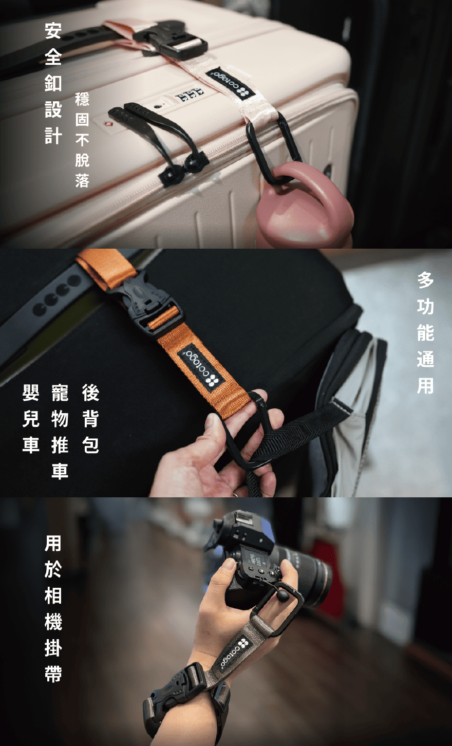 行李太多?這一扣,全部搞定。cctogo行李掛鉤釦,選用安全扣設計,穩固耐用不脫落,適用各式行李箱、手提袋、後背包、甚至嬰兒車與推車。✔︎ 安全扣件設計,穩固不脫落✔︎適用行李箱、各類包袋、嬰兒車、推車...等✔︎可調節長度,隨意吊掛✔︎9色可選,輕鬆搭配你的旅行風格每一扣,都是貼心的旅行小幫手。