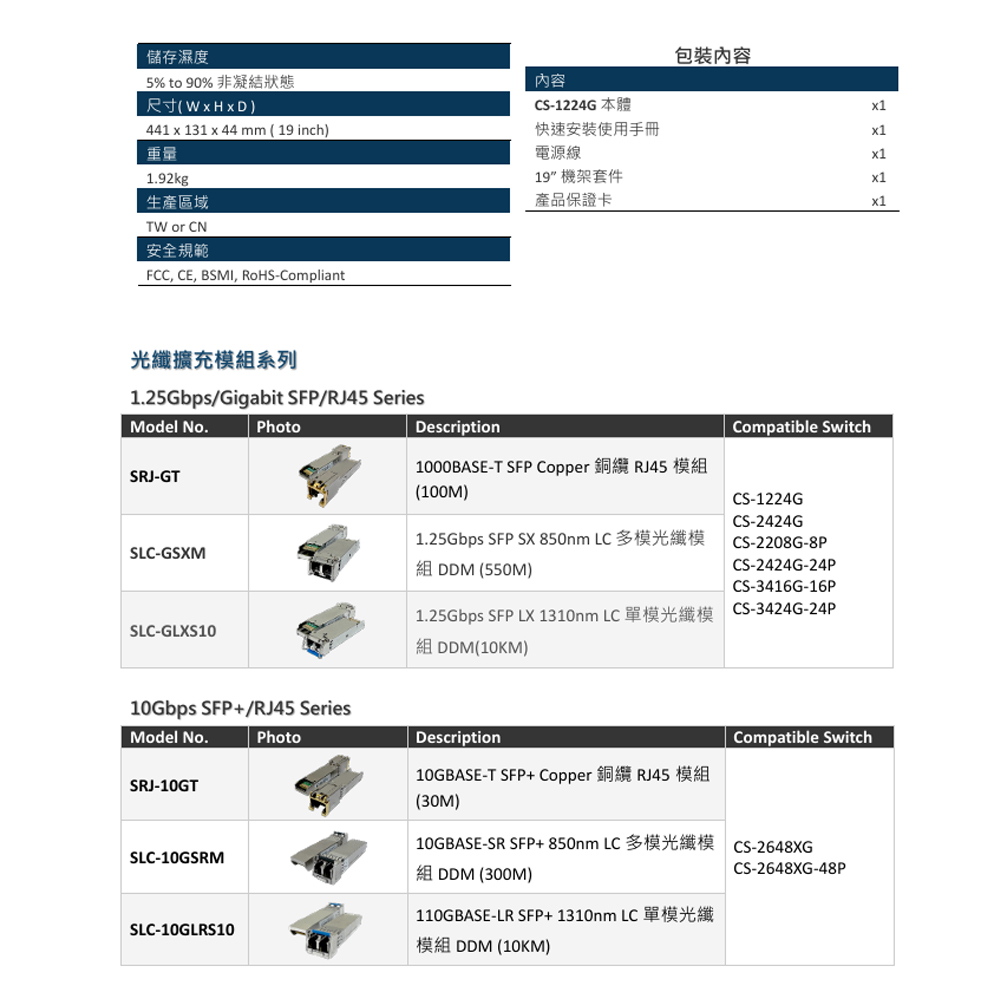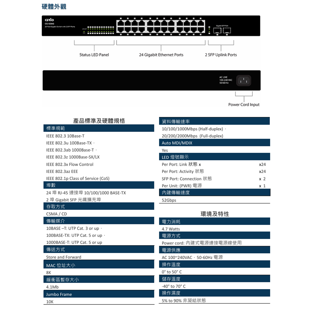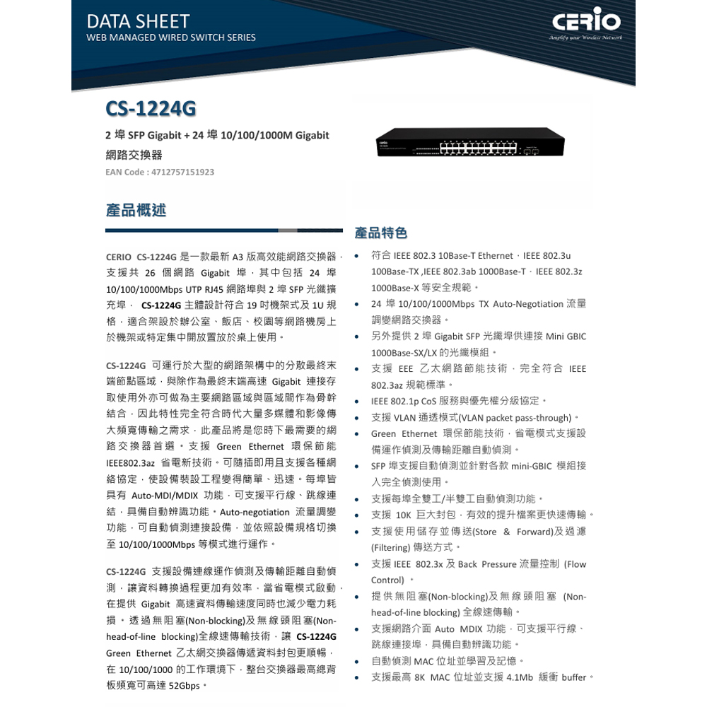 昌運監視器 CERIO 智鼎 CS-1224G A3 2埠 SFP Gigabit+24埠 Gigabit 網路交換器