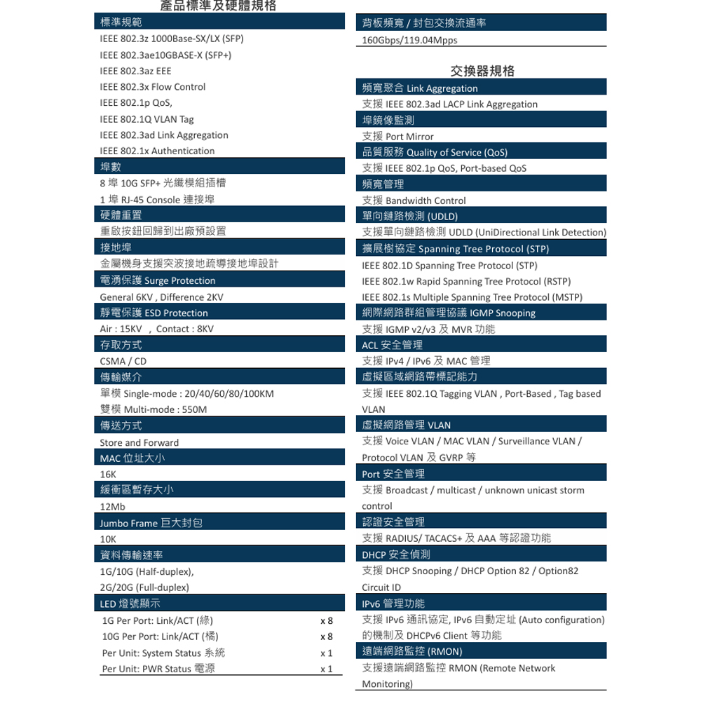 • 符合IEEE 802.3z 1000Base-SX/LX (SFP), IEEE 802.3ae 10GBASE-X (SFP+) 及IEEE 802.3x Flow Control等標準規範。