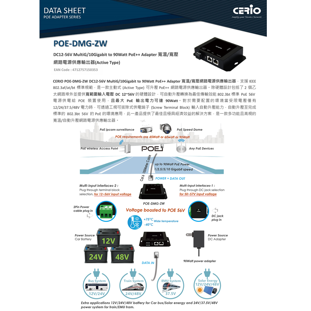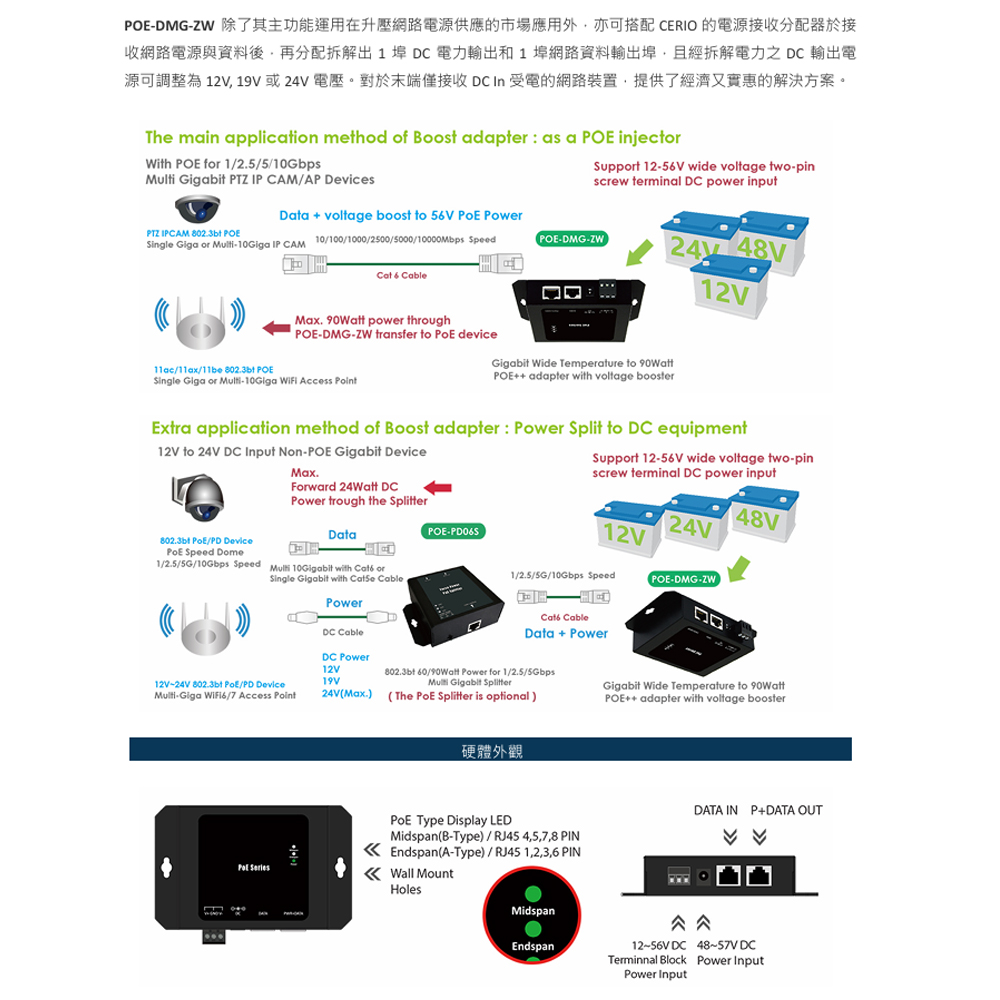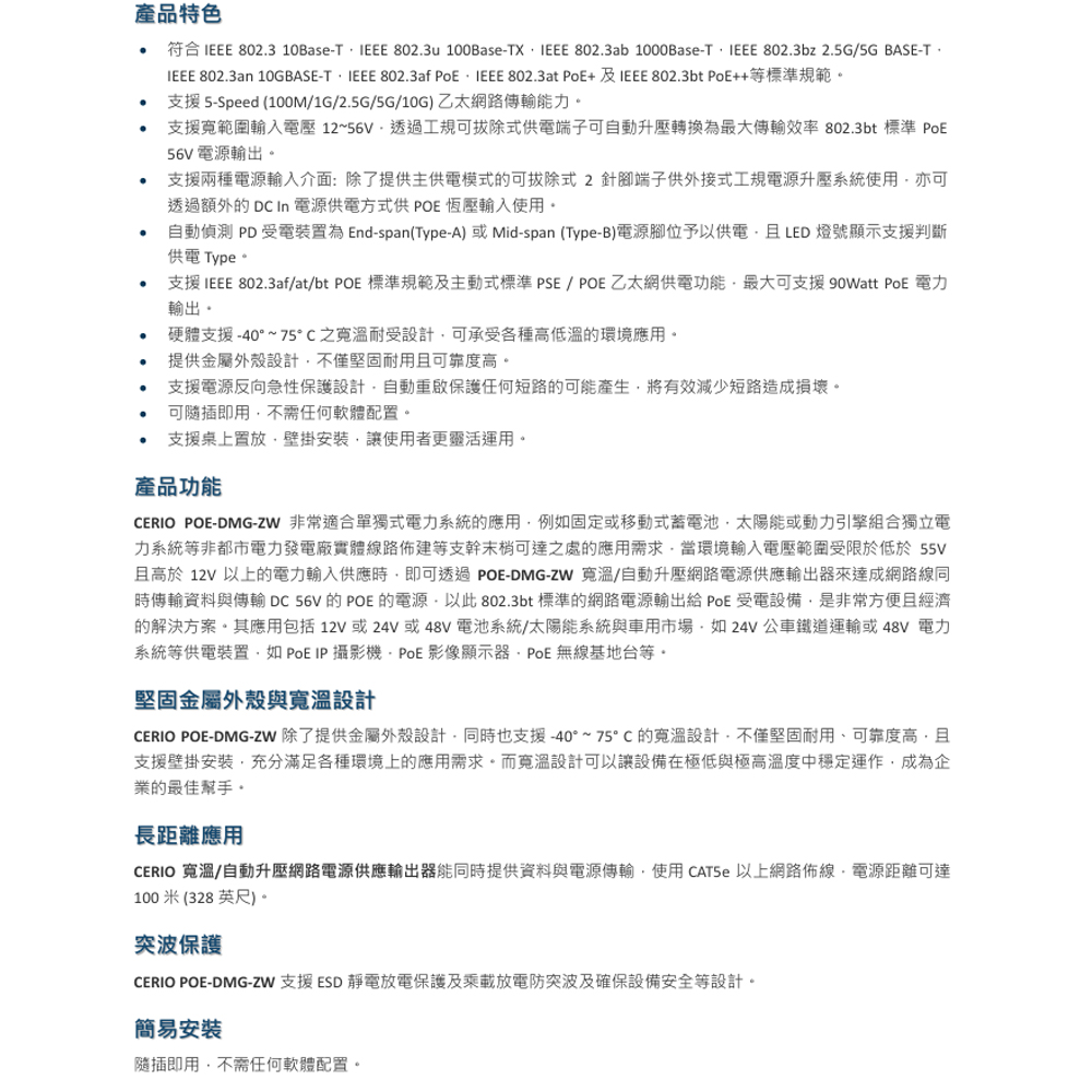 昌運監視器 CERIO 智鼎 POE-DMG-ZW DC12-56V 寬溫/寬壓網路電源供應輸出器