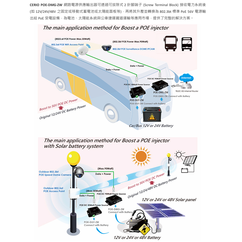 • 支援寬範圍輸入電壓12~56V,透過工規可拔除式供電端子可自動升壓轉換為最大傳輸效率802.3bt標準PoE 56V 電源輸出。
